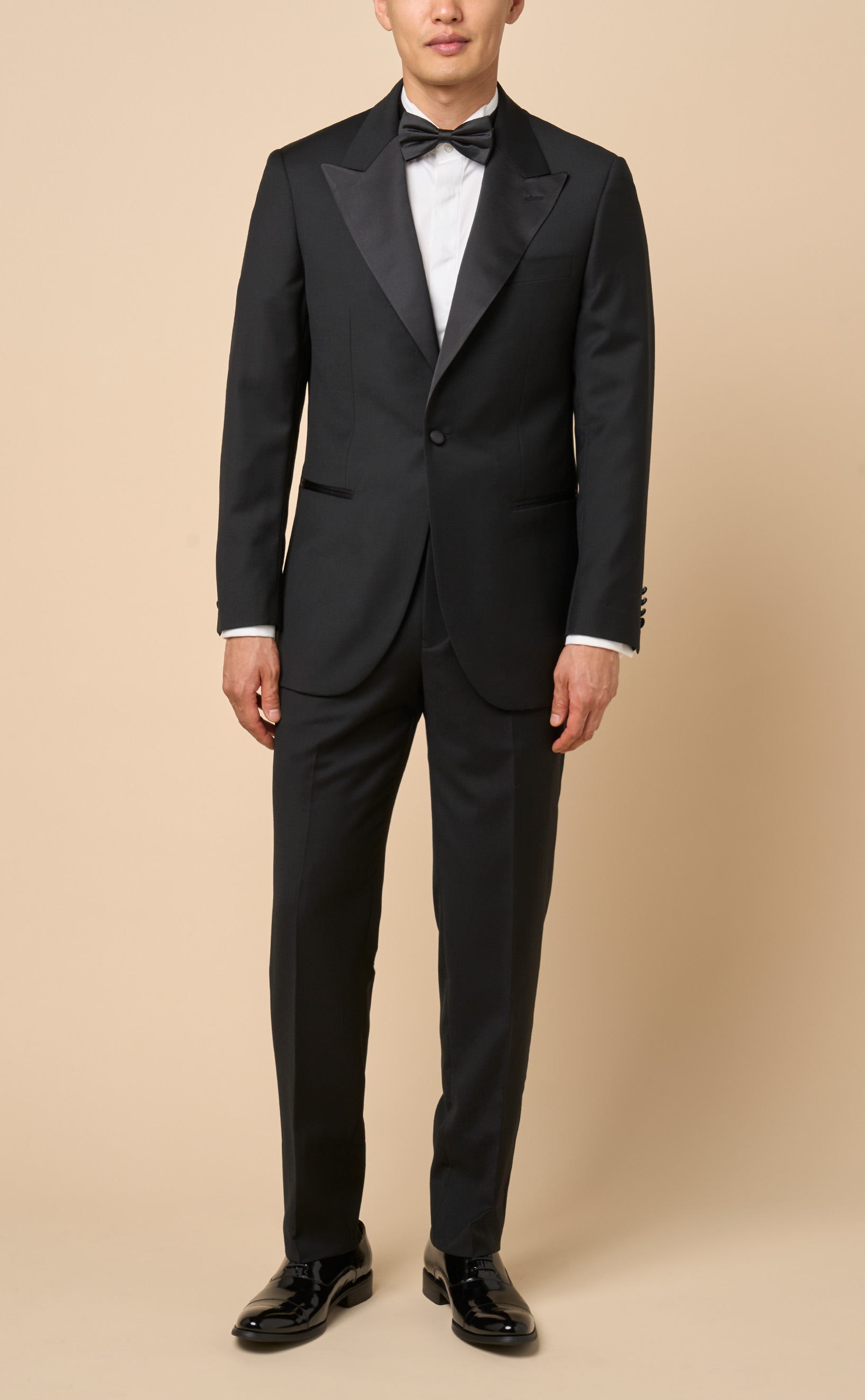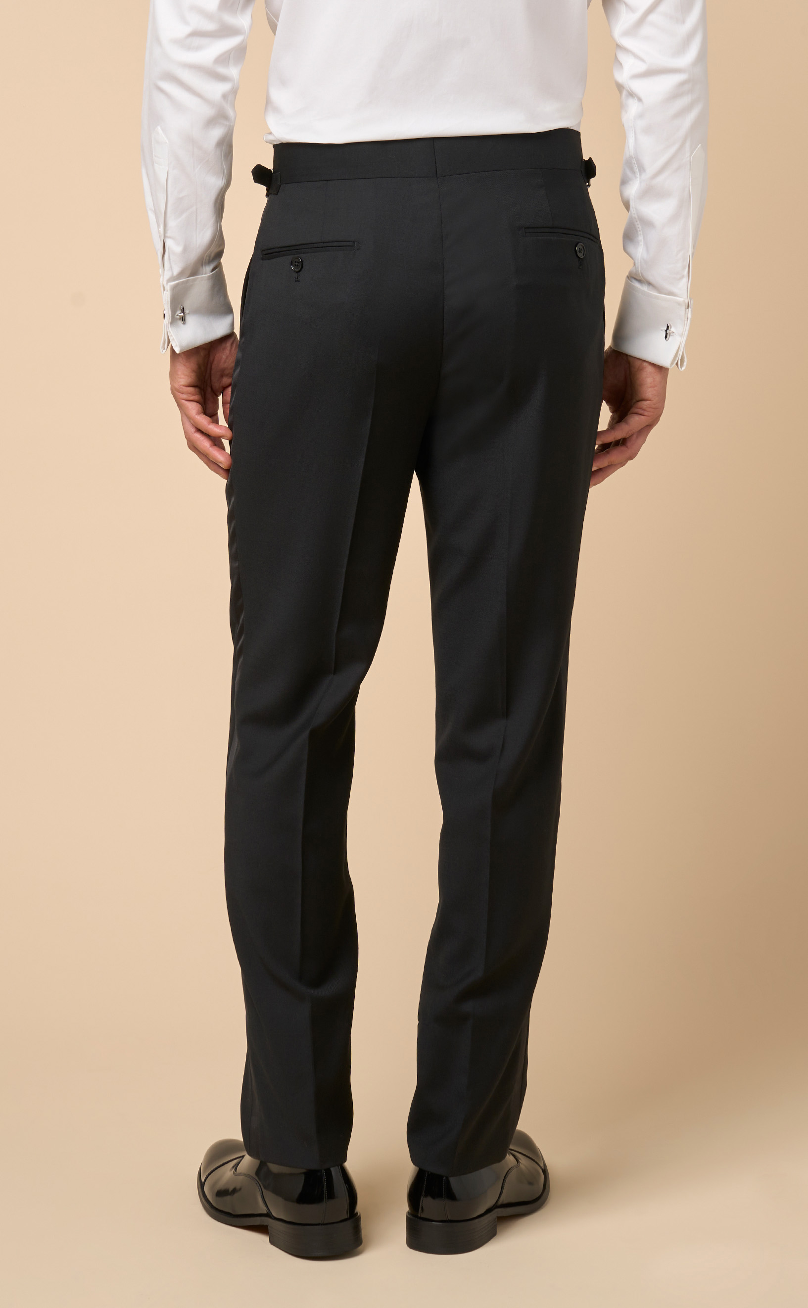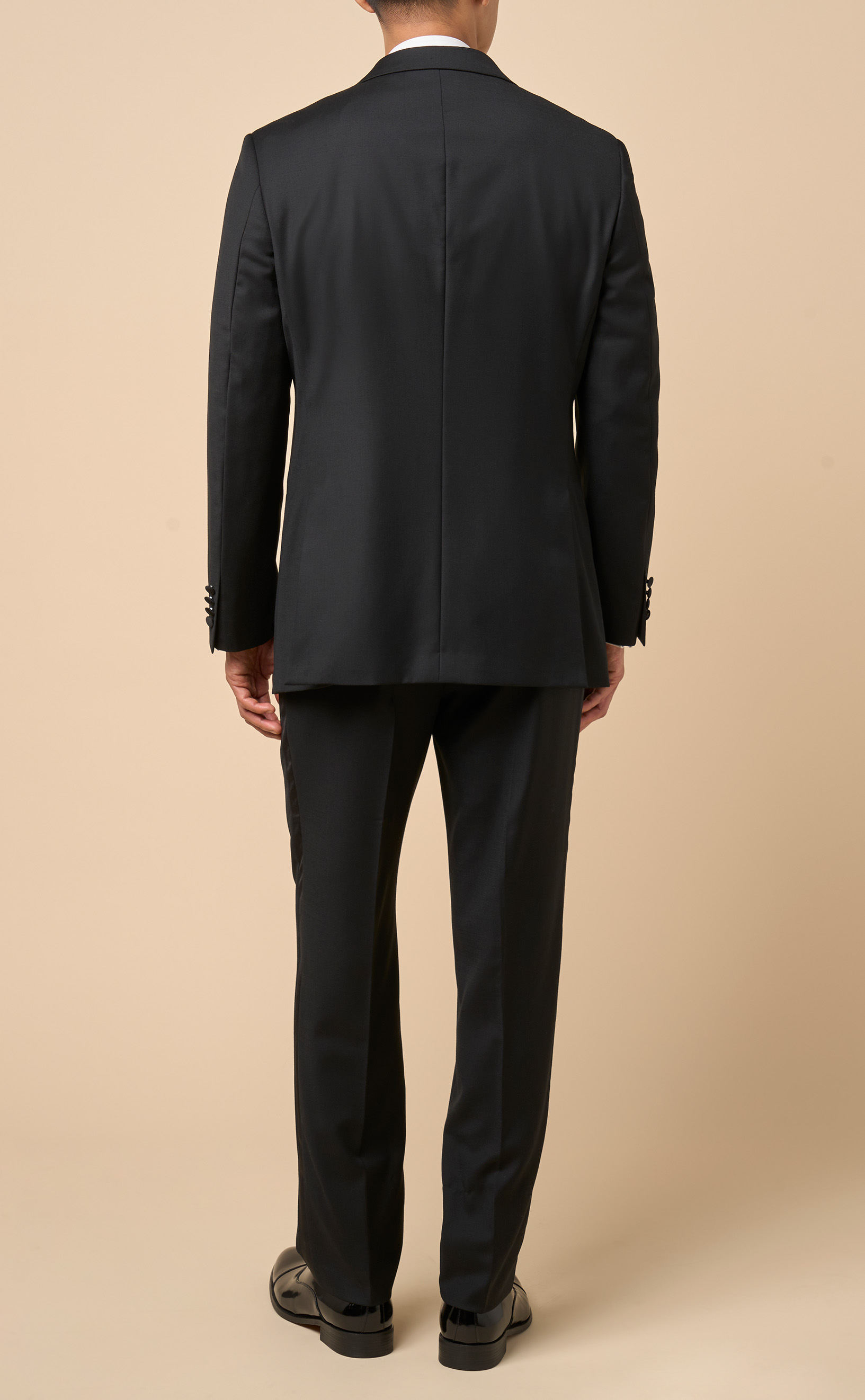 A refined take on formalwear, this Black 100% wool tuxedo features a half-canvas jacket with satin peak lapels, a one-button closure, and a full navy lining. Paired with flat-front trousers finished with side-tab adjusters and a satin outseam stripe for a timeless, tailored look.