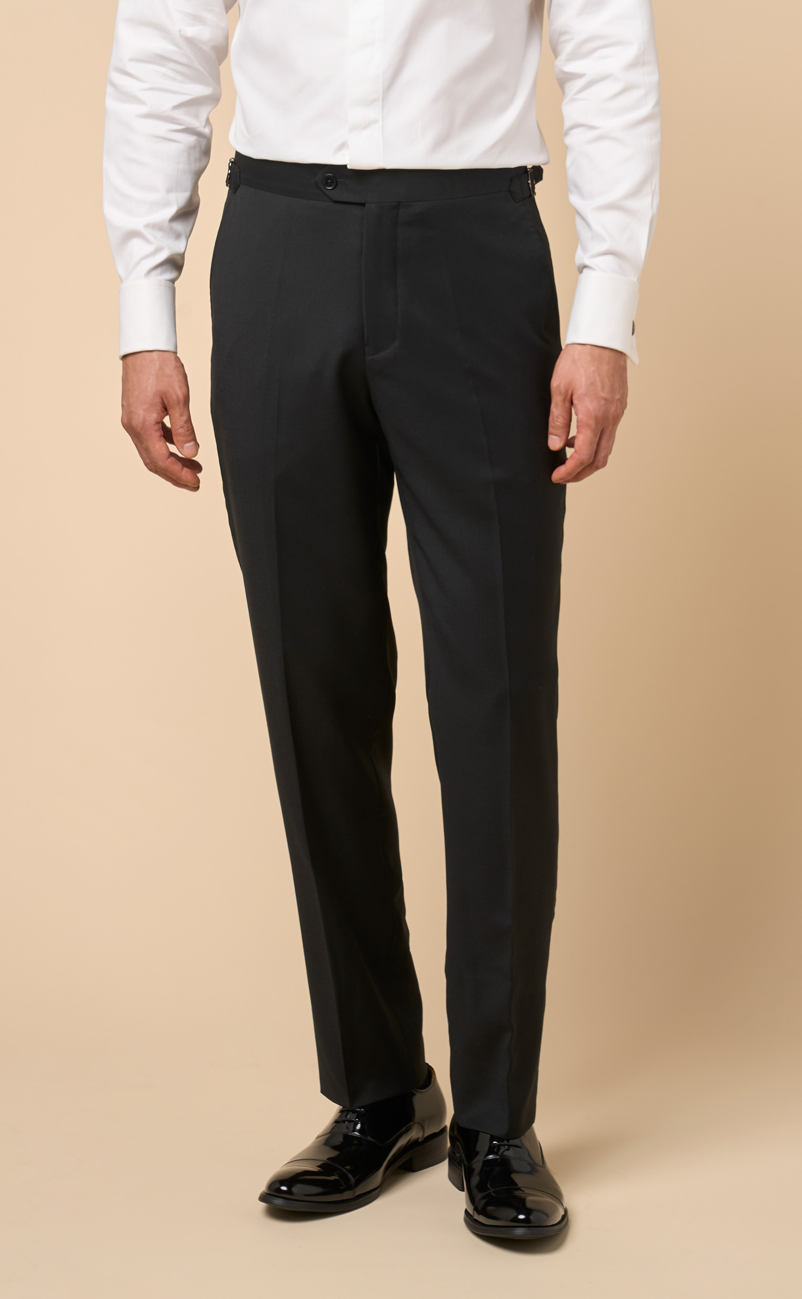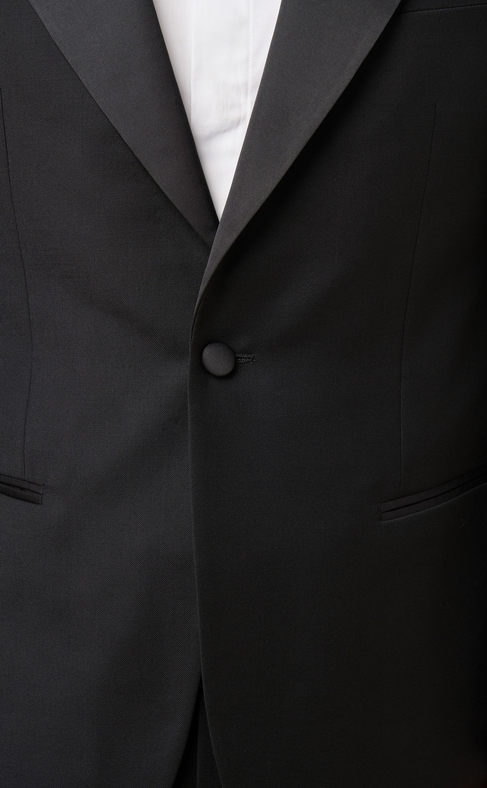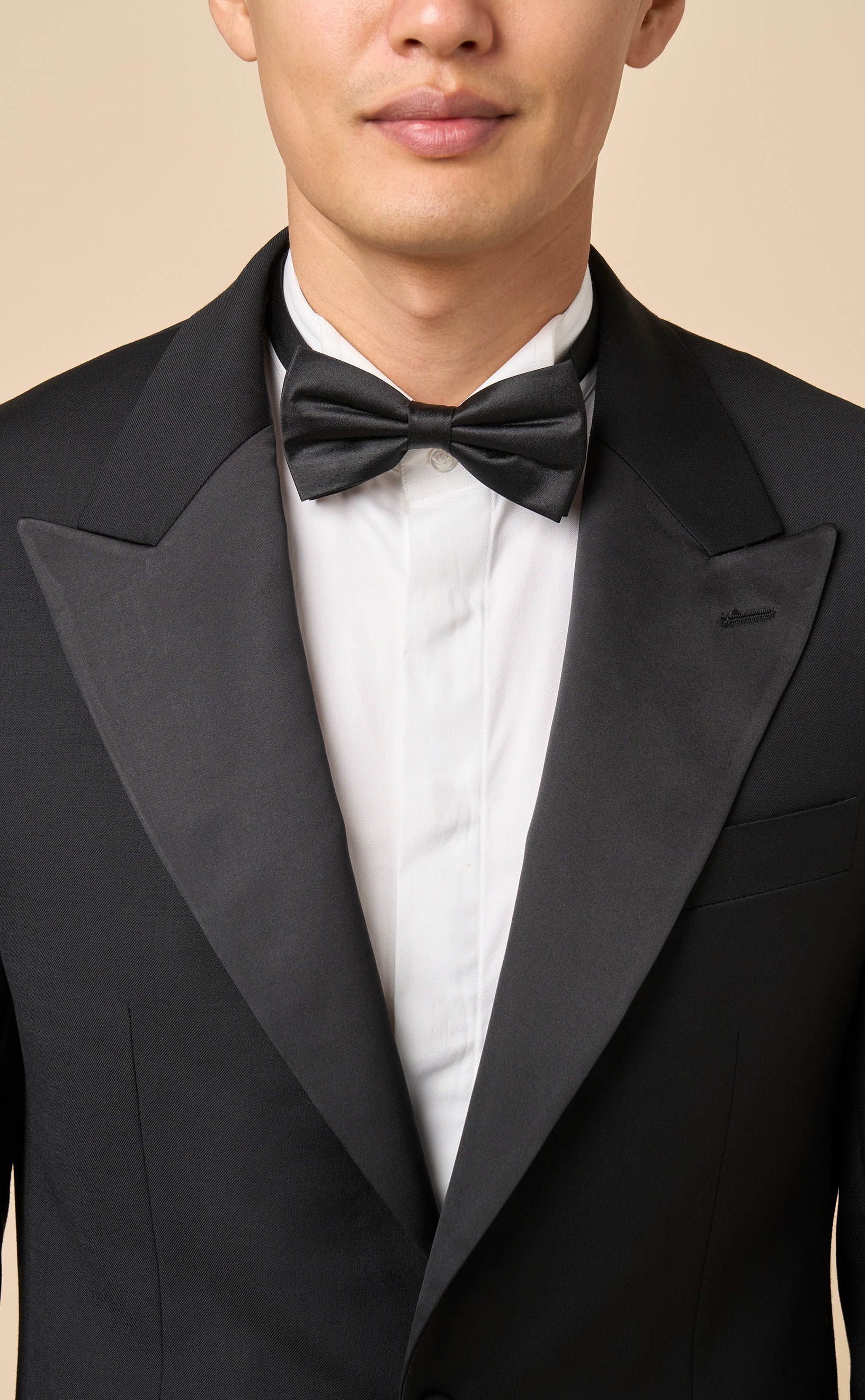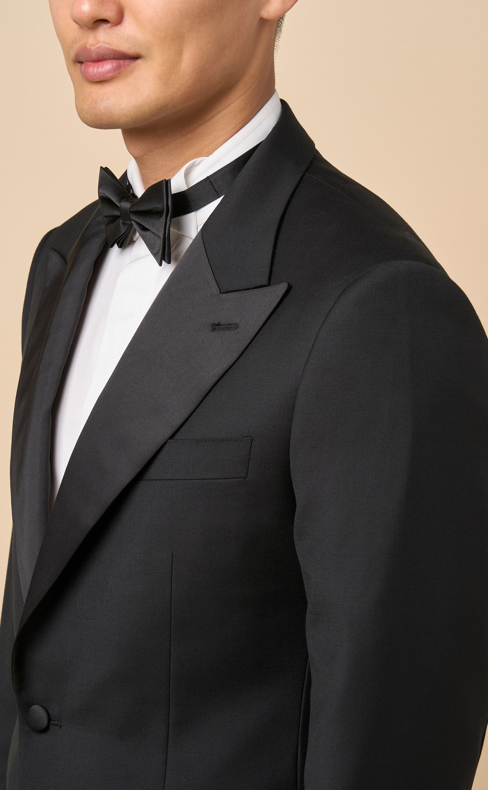 A refined take on formalwear, this Black 100% wool tuxedo features a half-canvas jacket with satin peak lapels, a one-button closure, and a full navy lining. Paired with flat-front trousers finished with side-tab adjusters and a satin outseam stripe for a timeless, tailored look.