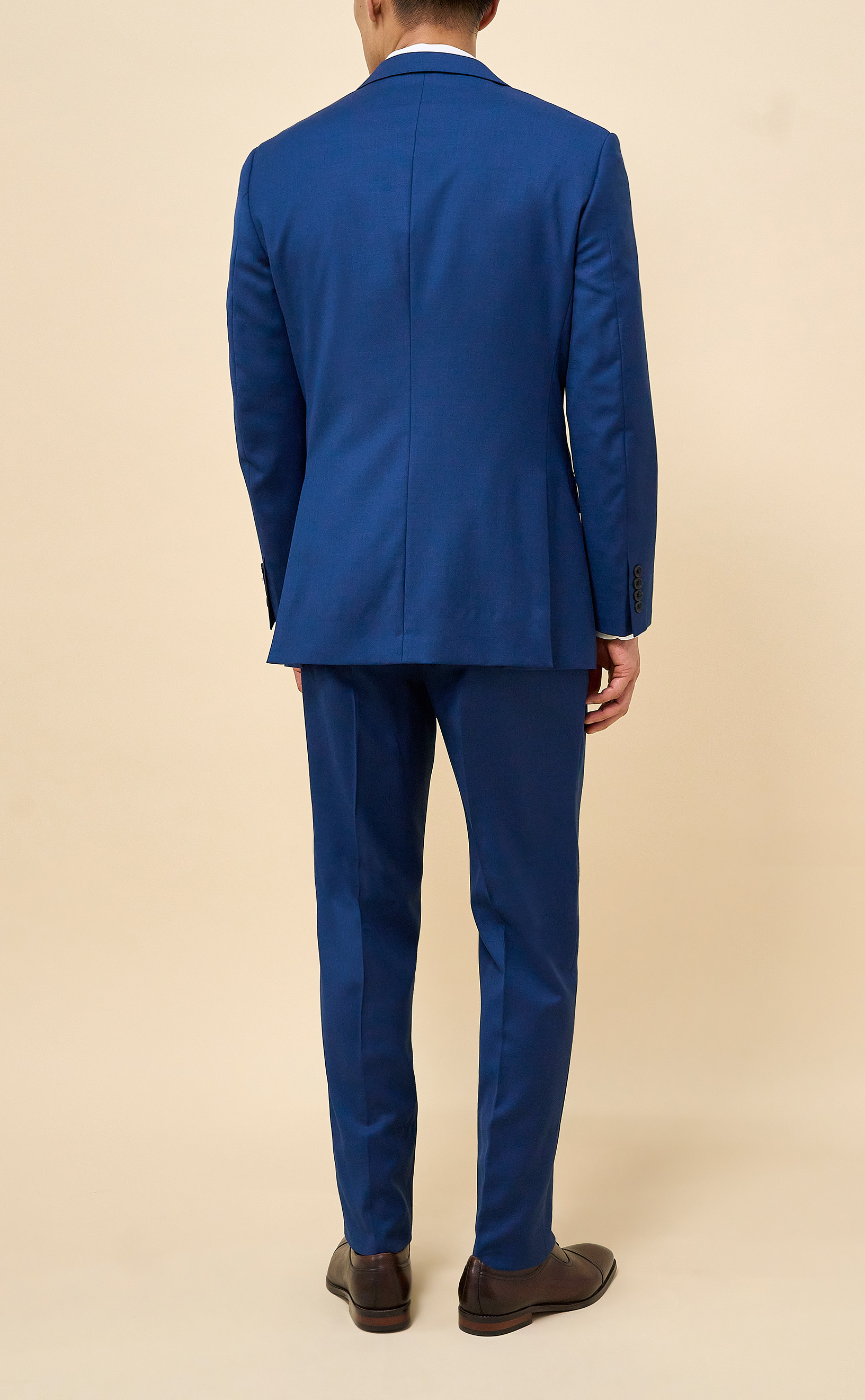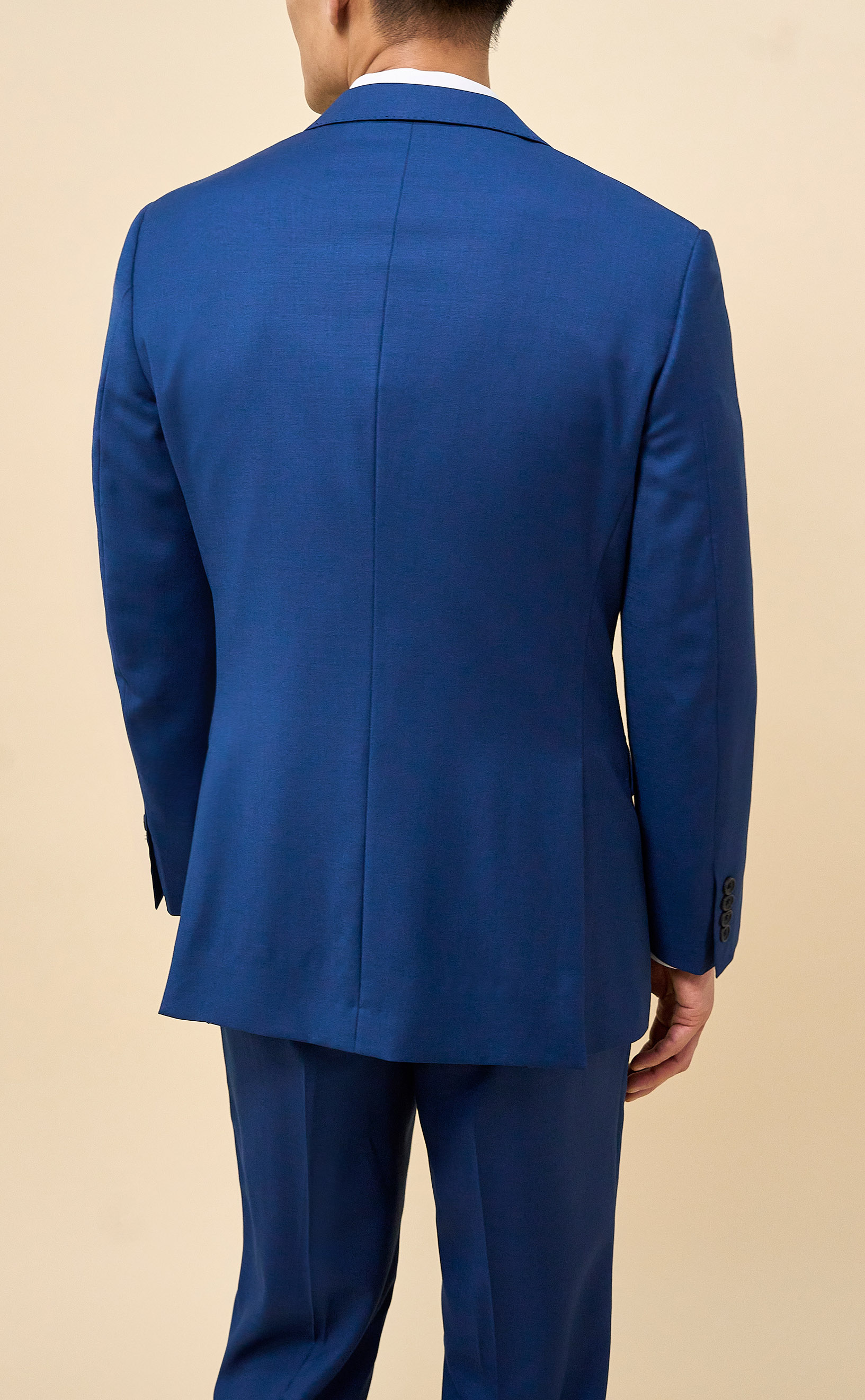 Crafted from 100% Merino wool in an all-season weight, this Bright Blue suit delivers year-round comfort with refined structure and drape. The half-canvassed jacket features lightly padded shoulders, notch lapels, a two-button closure, and double vents. Flat-front trousers with slanted pockets, rear button-through pockets, and an unfinished inseam complete the look, ready for custom tailoring.