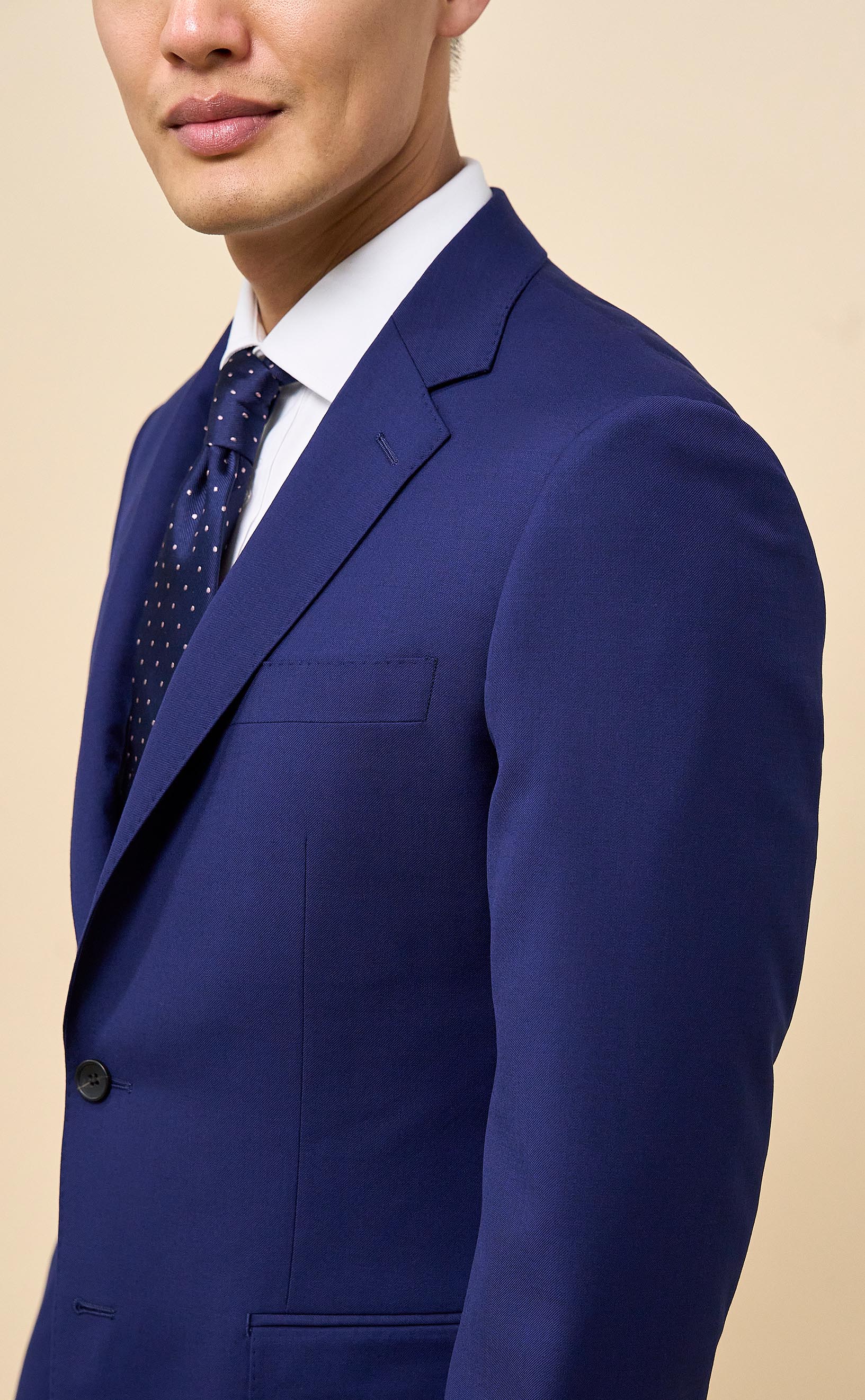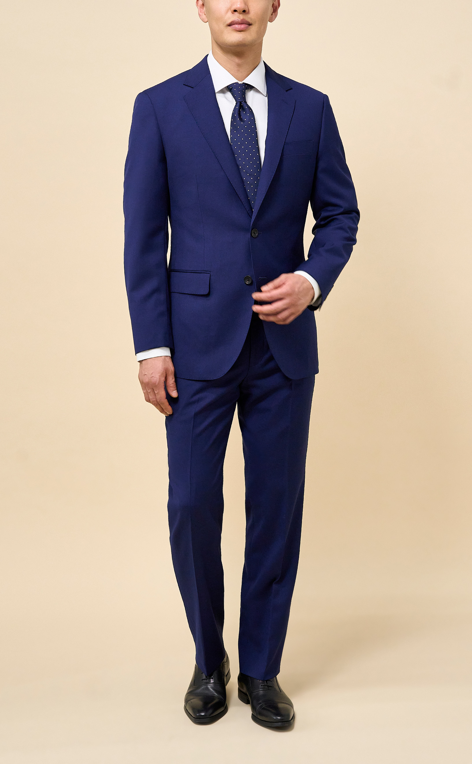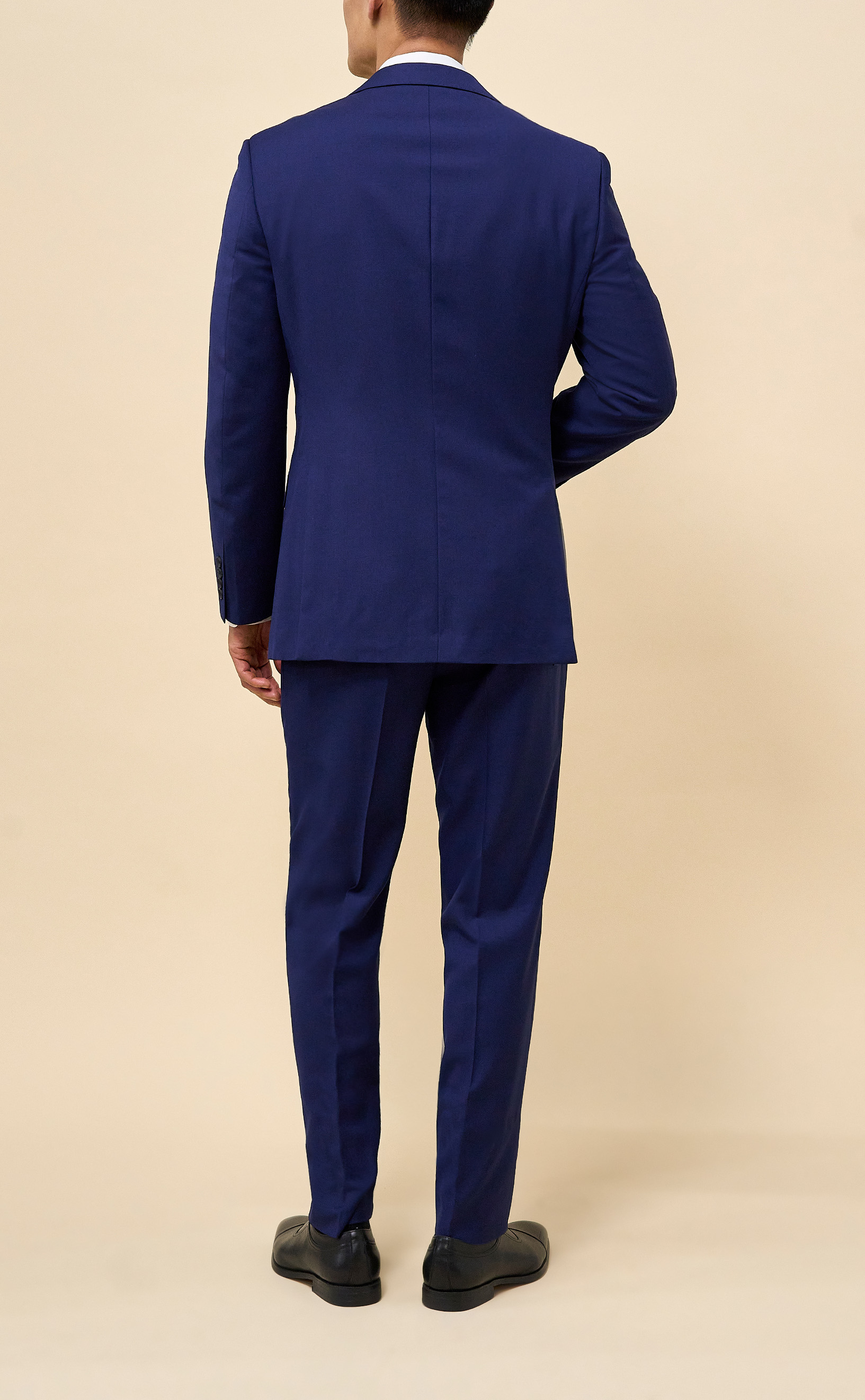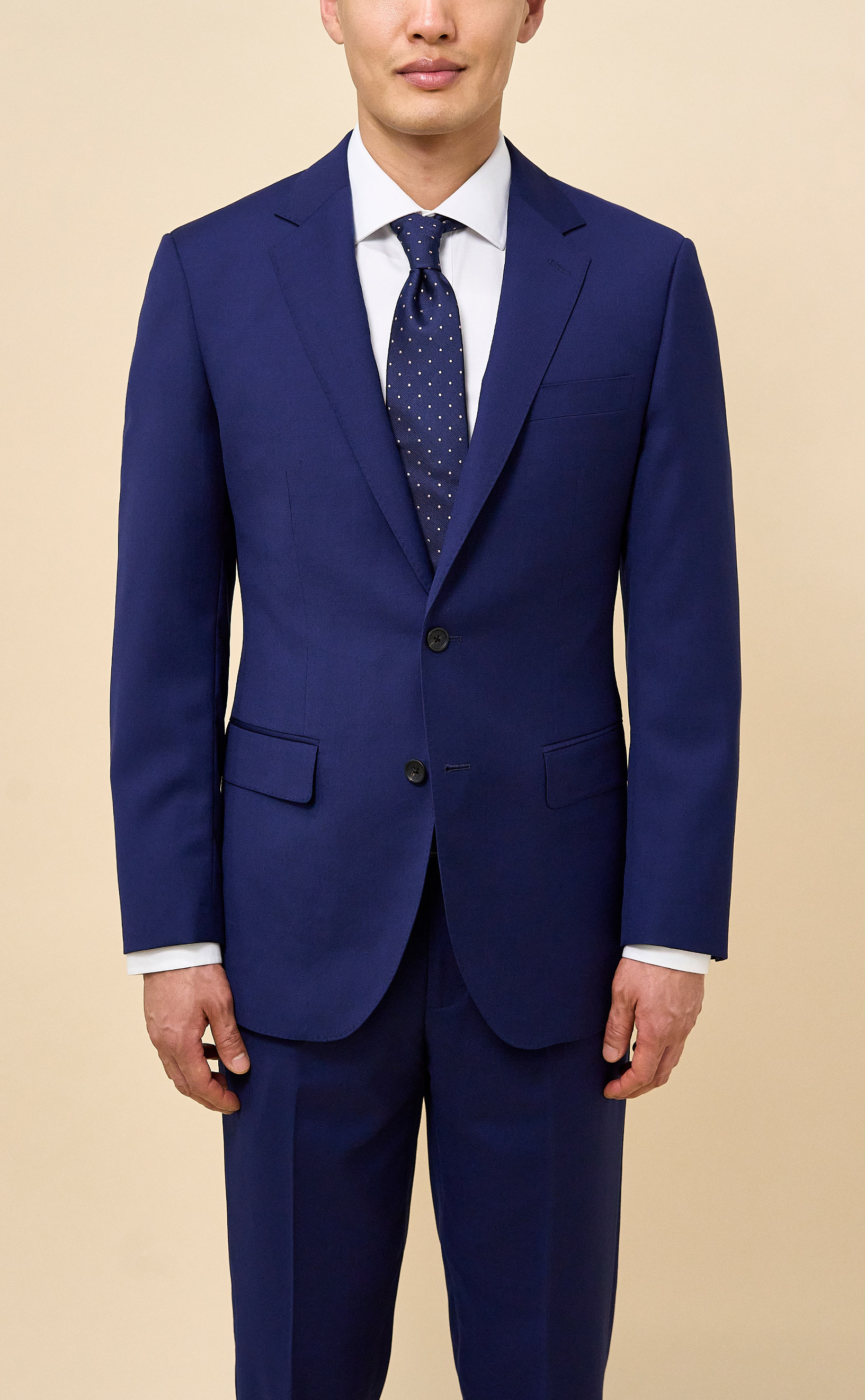 Crafted from 100% Merino wool in an all-season weight, this Bright Navy suit delivers year-round comfort with refined structure and drape. The half-canvassed jacket features lightly padded shoulders, notch lapels, a two-button closure, and double vents. Flat-front trousers with slanted pockets, rear button-through pockets, and an unfinished inseam complete the look, ready for custom tailoring.