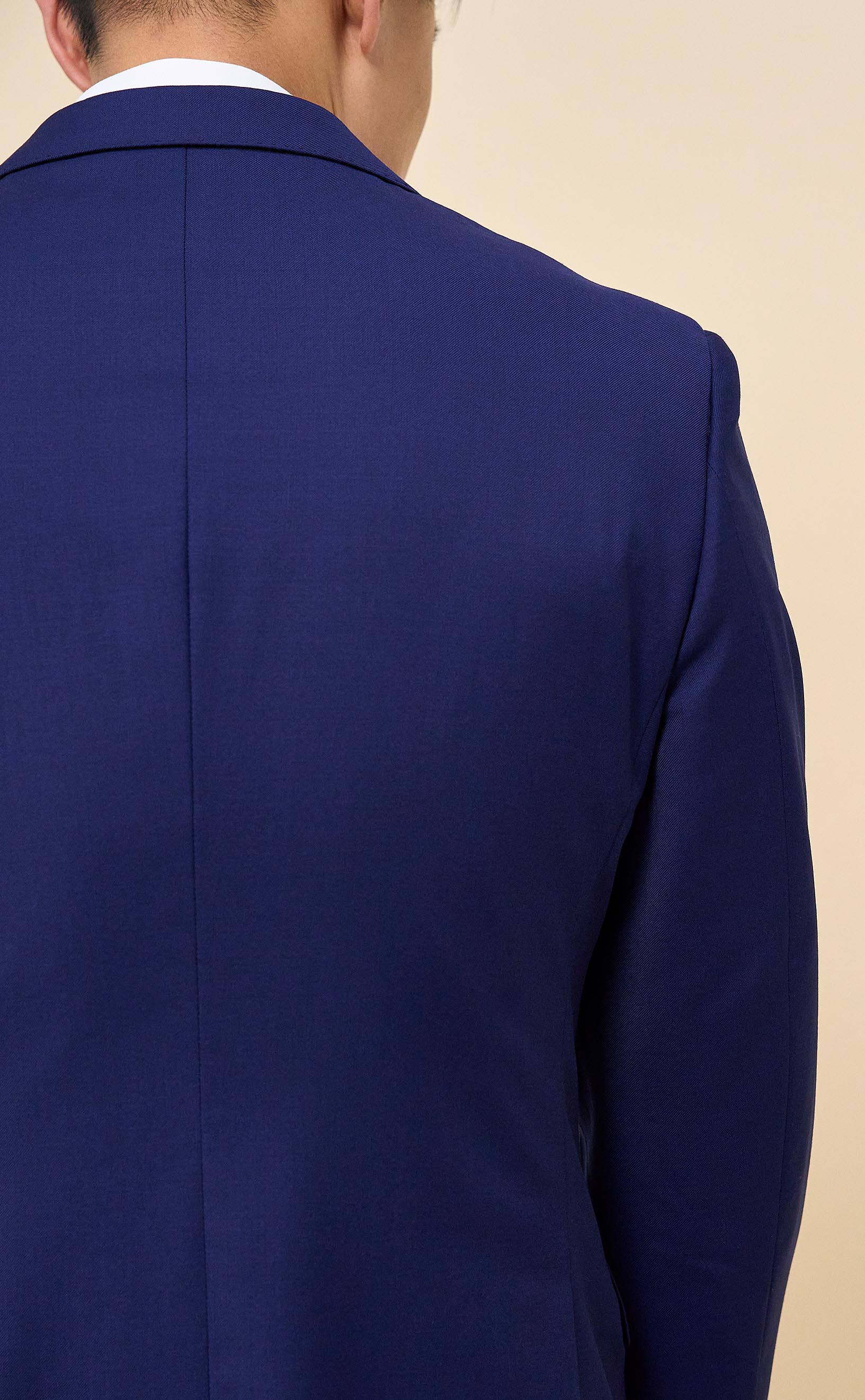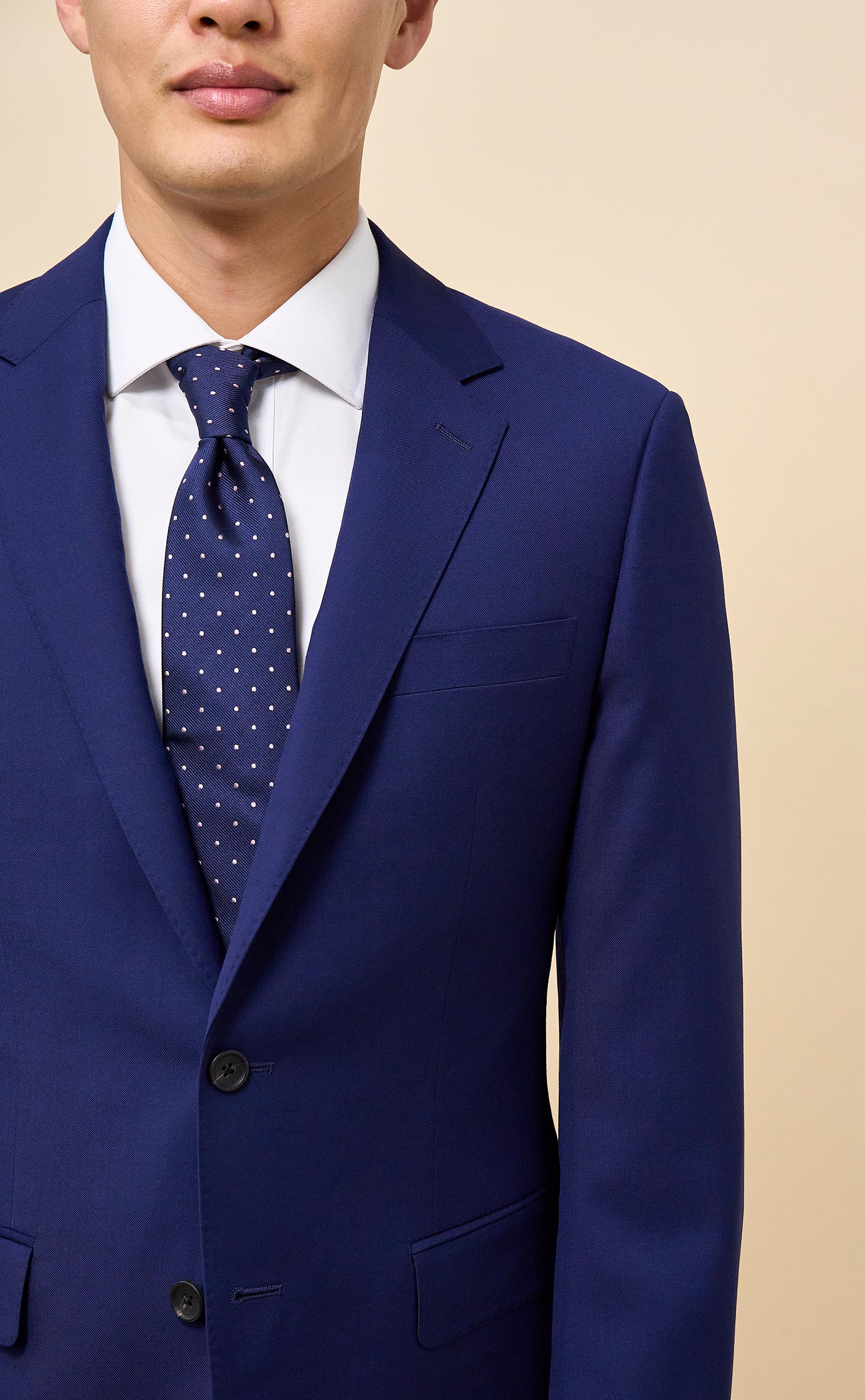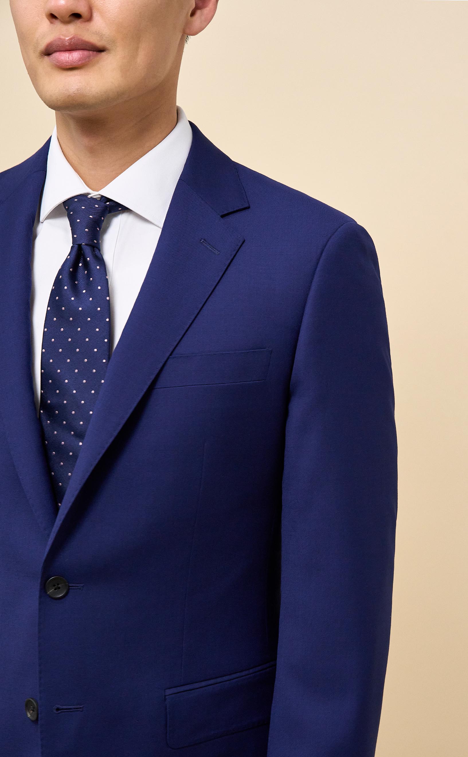 Crafted from 100% Merino wool in an all-season weight, this Bright Navy suit delivers year-round comfort with refined structure and drape. The half-canvassed jacket features lightly padded shoulders, notch lapels, a two-button closure, and double vents. Flat-front trousers with slanted pockets, rear button-through pockets, and an unfinished inseam complete the look, ready for custom tailoring.