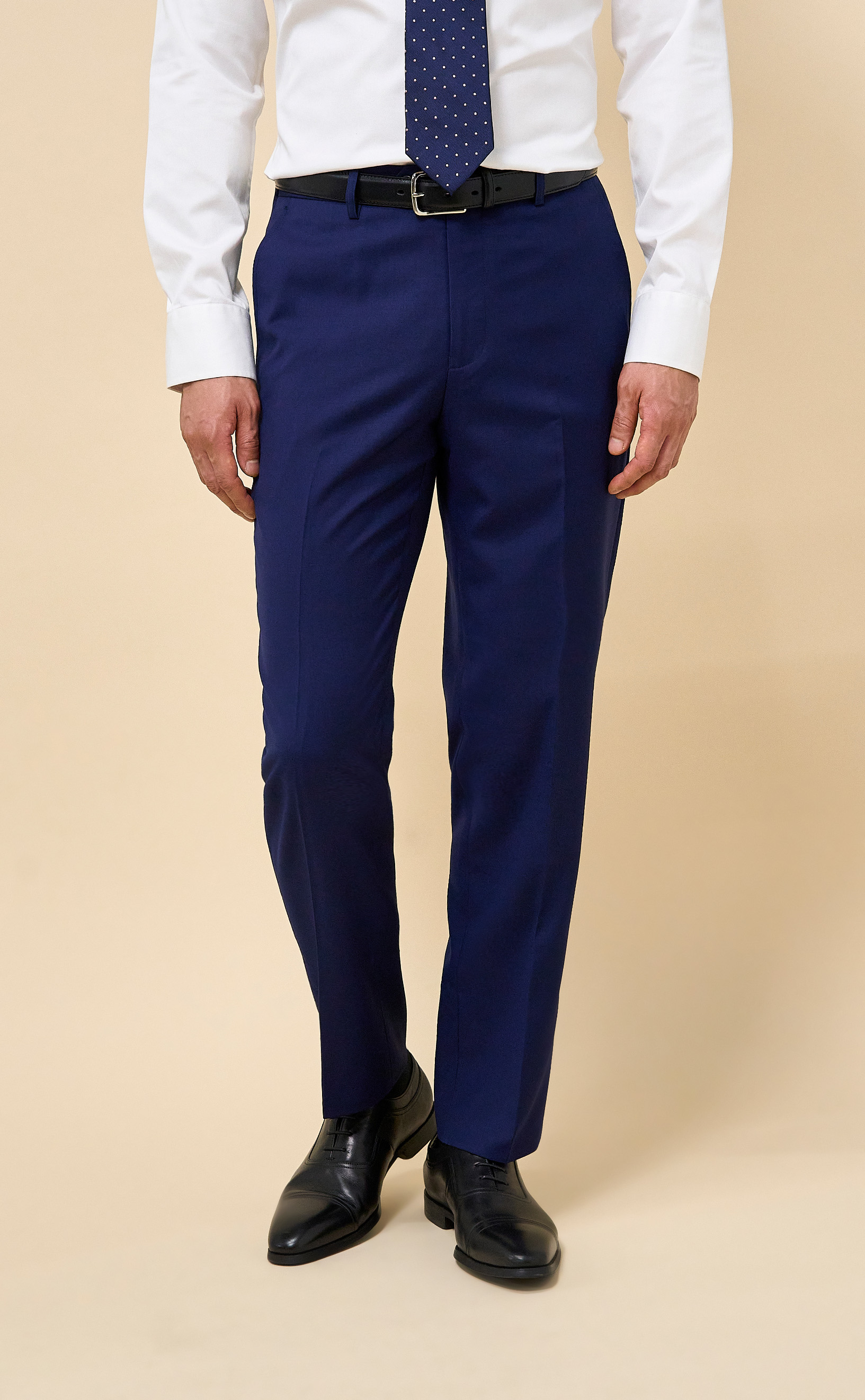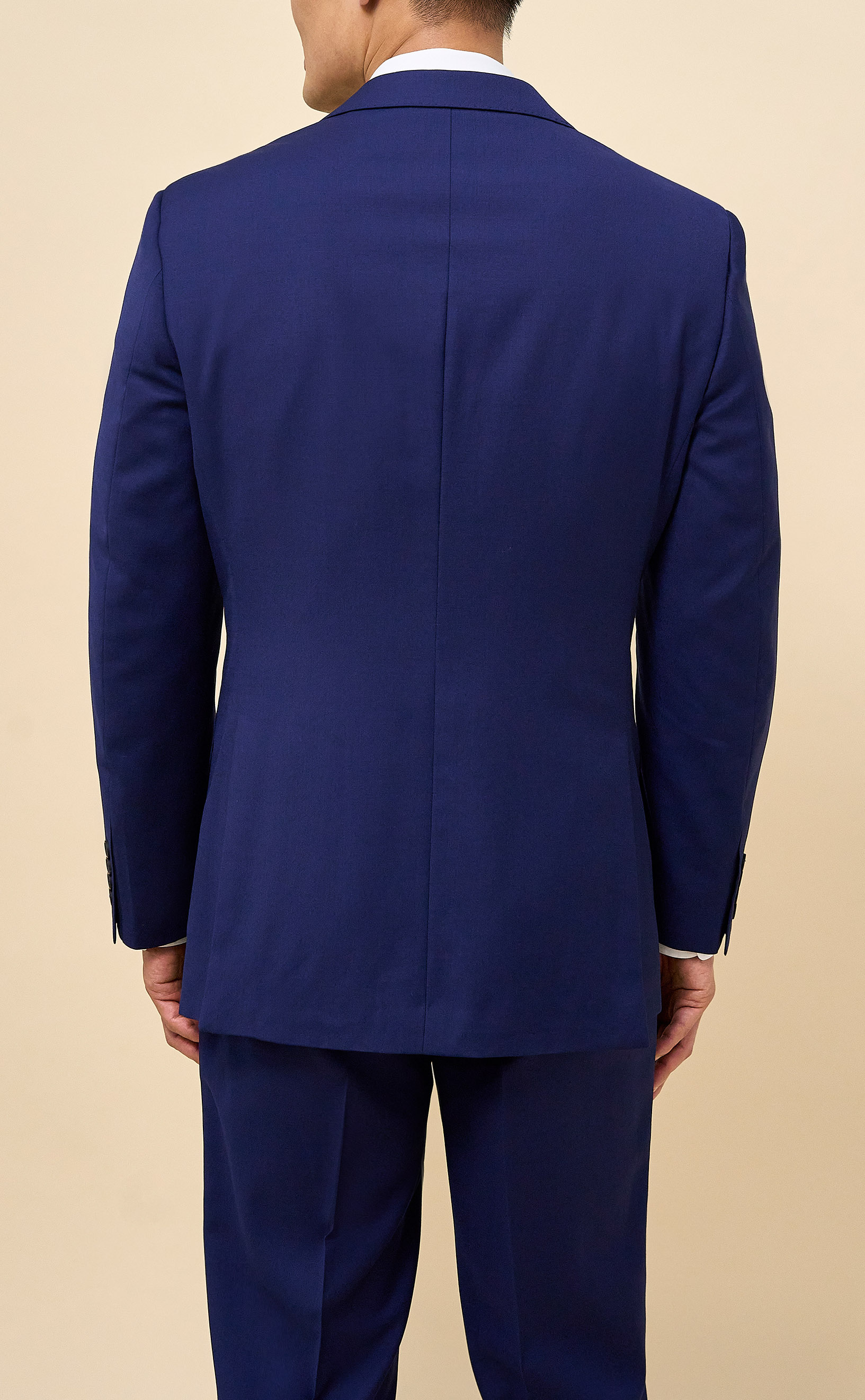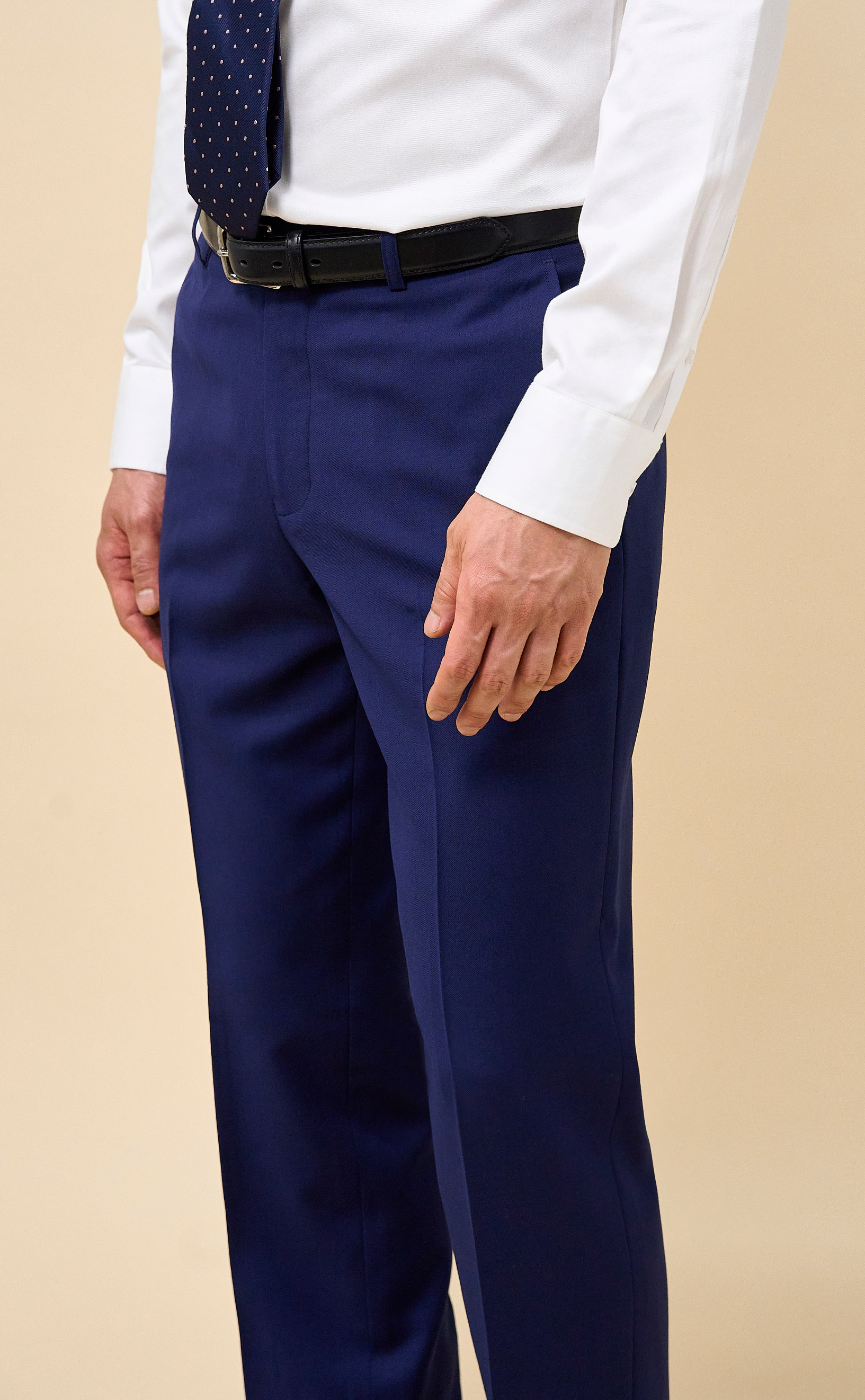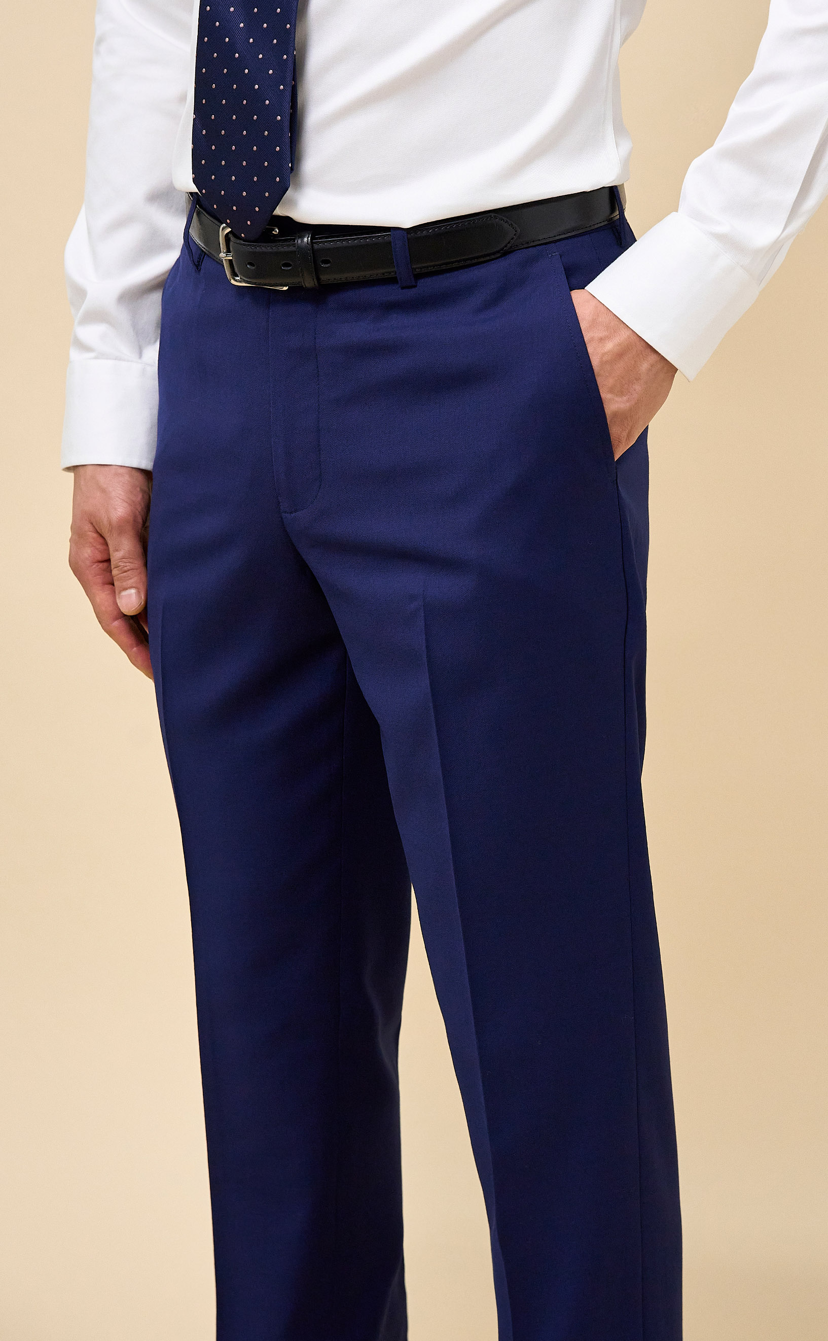 Crafted from 100% Merino wool in an all-season weight, this Bright Navy suit delivers year-round comfort with refined structure and drape. The half-canvassed jacket features lightly padded shoulders, notch lapels, a two-button closure, and double vents. Flat-front trousers with slanted pockets, rear button-through pockets, and an unfinished inseam complete the look, ready for custom tailoring.