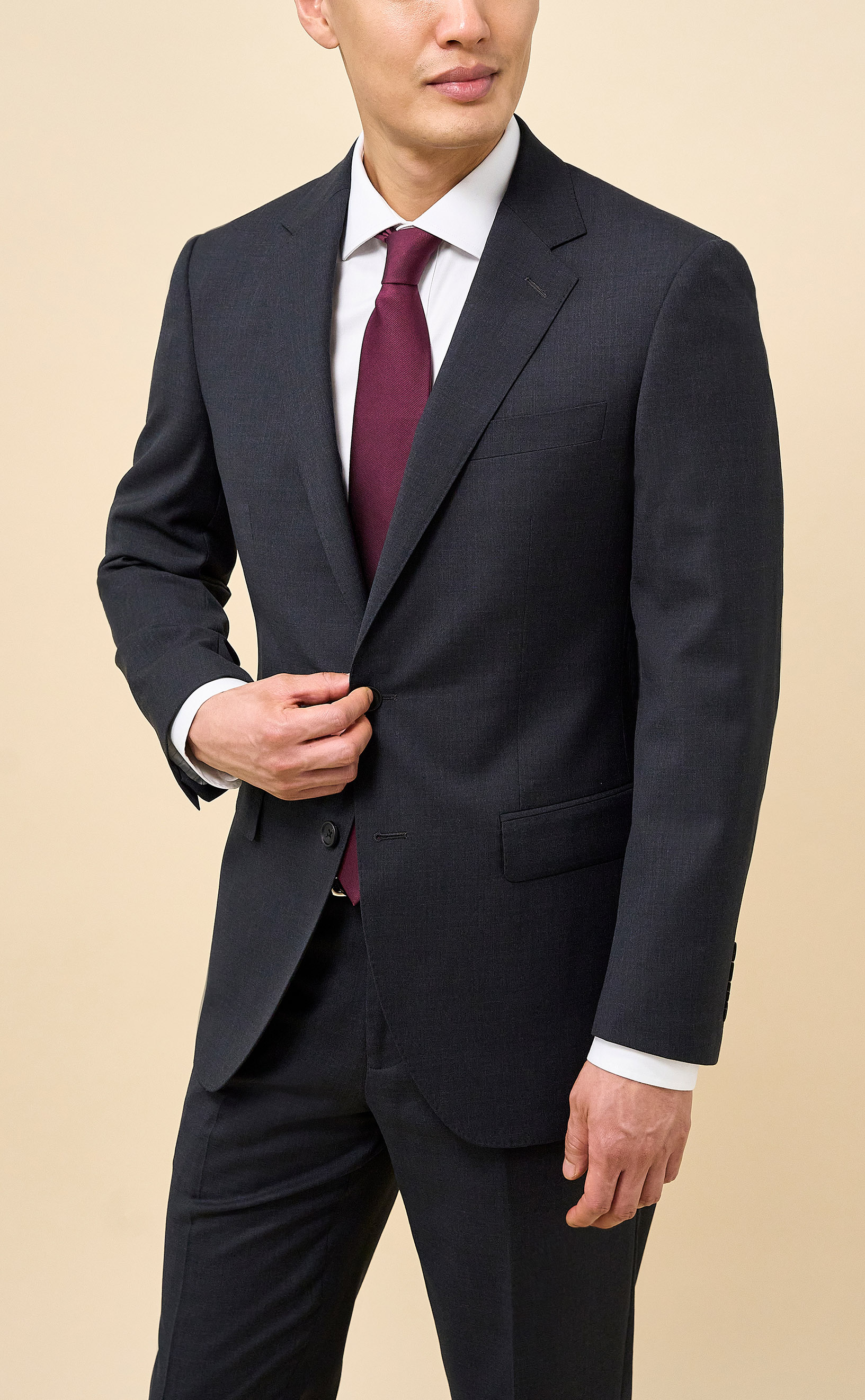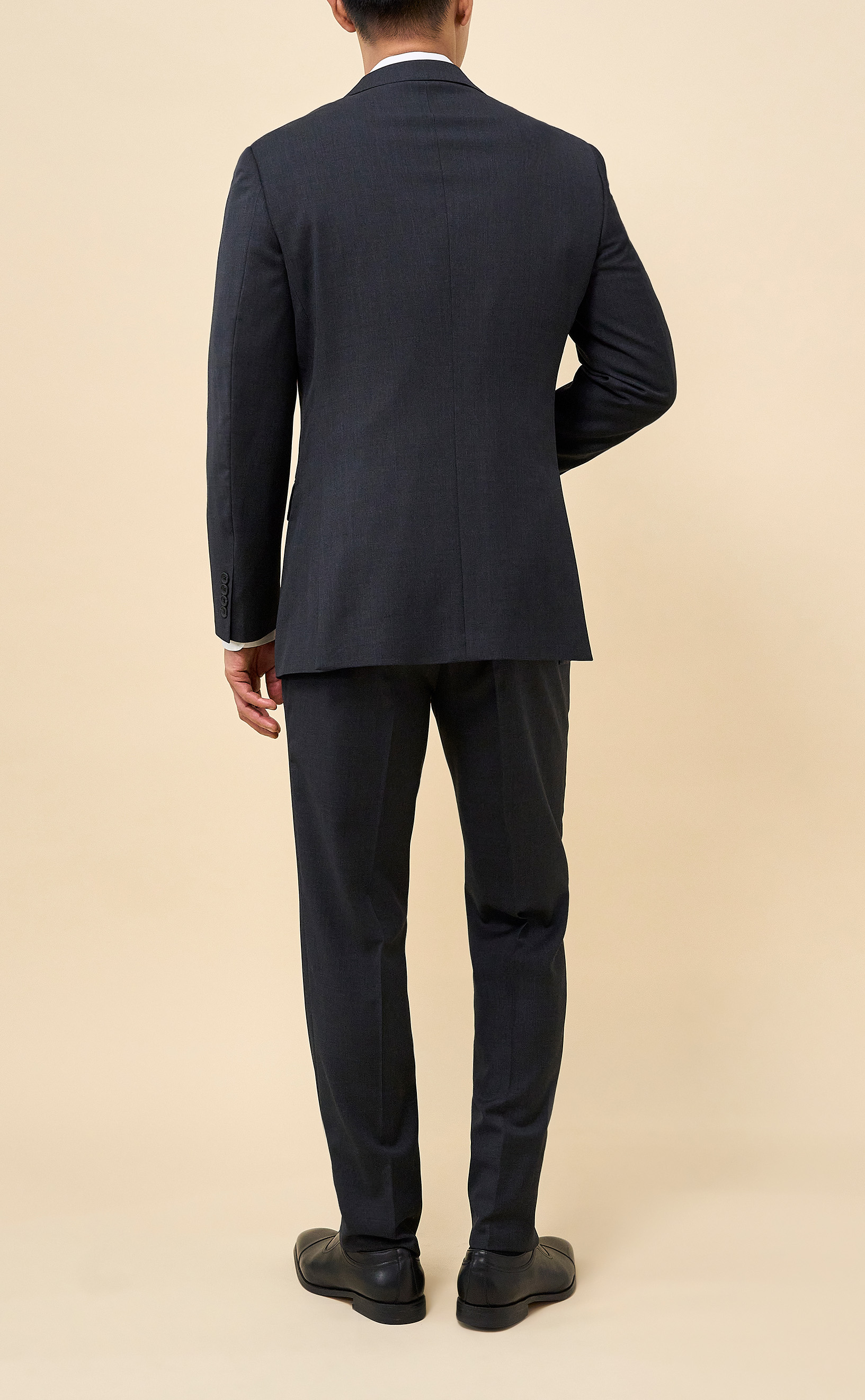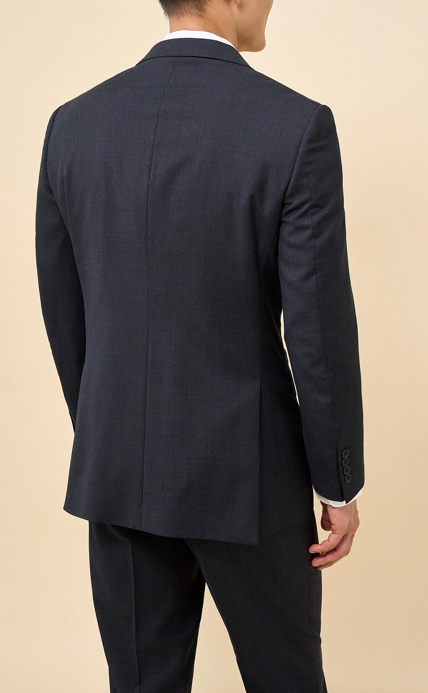 Crafted from 100% Merino wool in an all-season weight, this Charcoal suit delivers year-round comfort with refined structure and drape. The half-canvassed jacket features lightly padded shoulders, notch lapels, a two-button closure, and double vents. Flat-front trousers with slanted pockets, rear button-through pockets, and an unfinished inseam complete the look, ready for custom tailoring.
