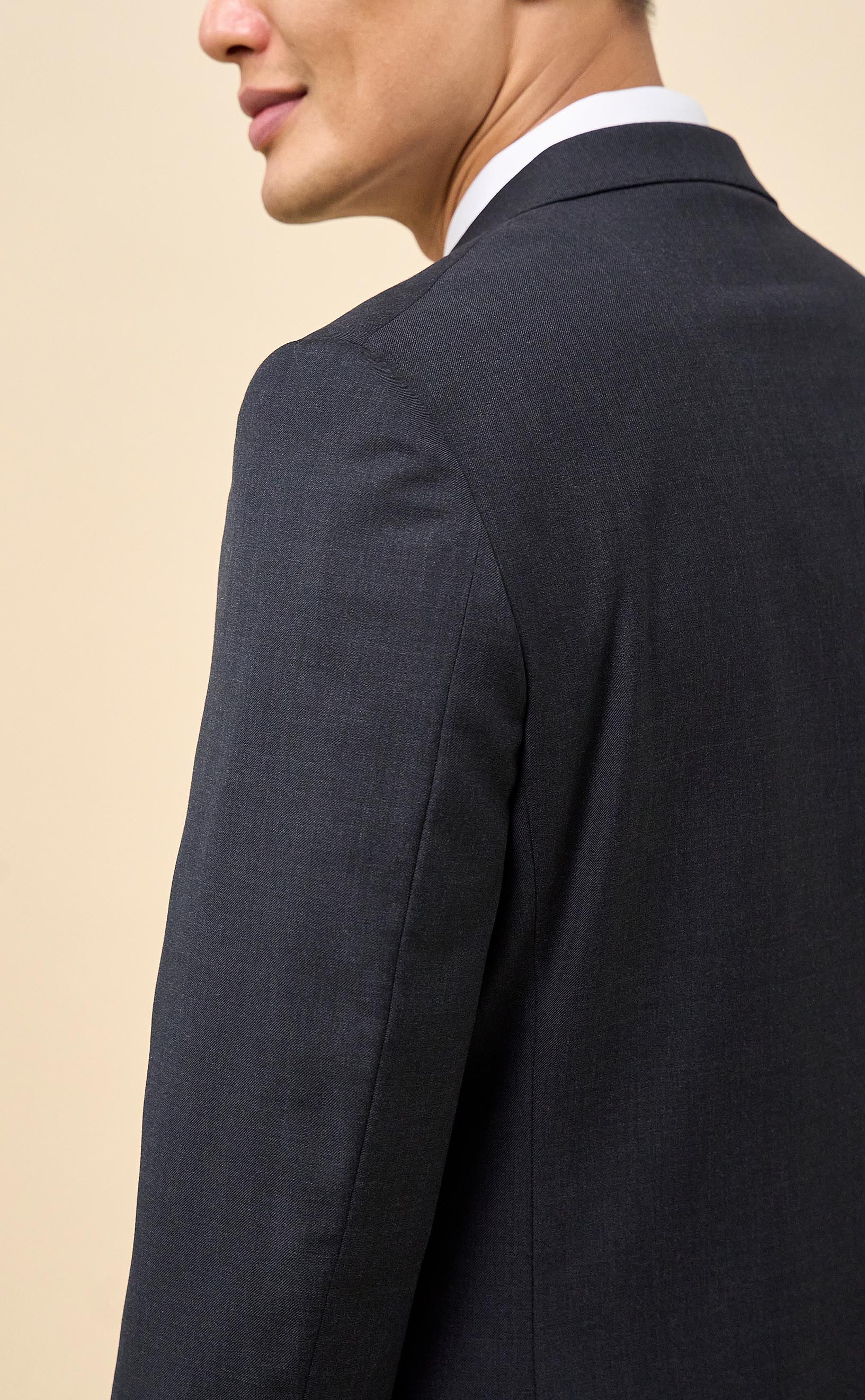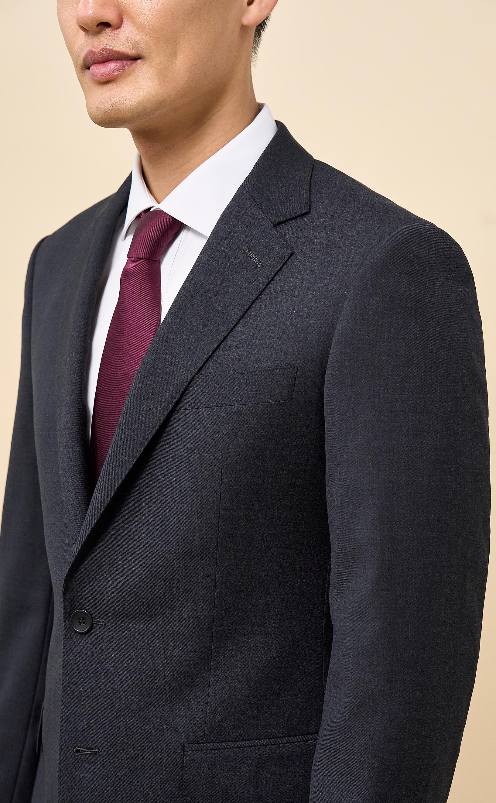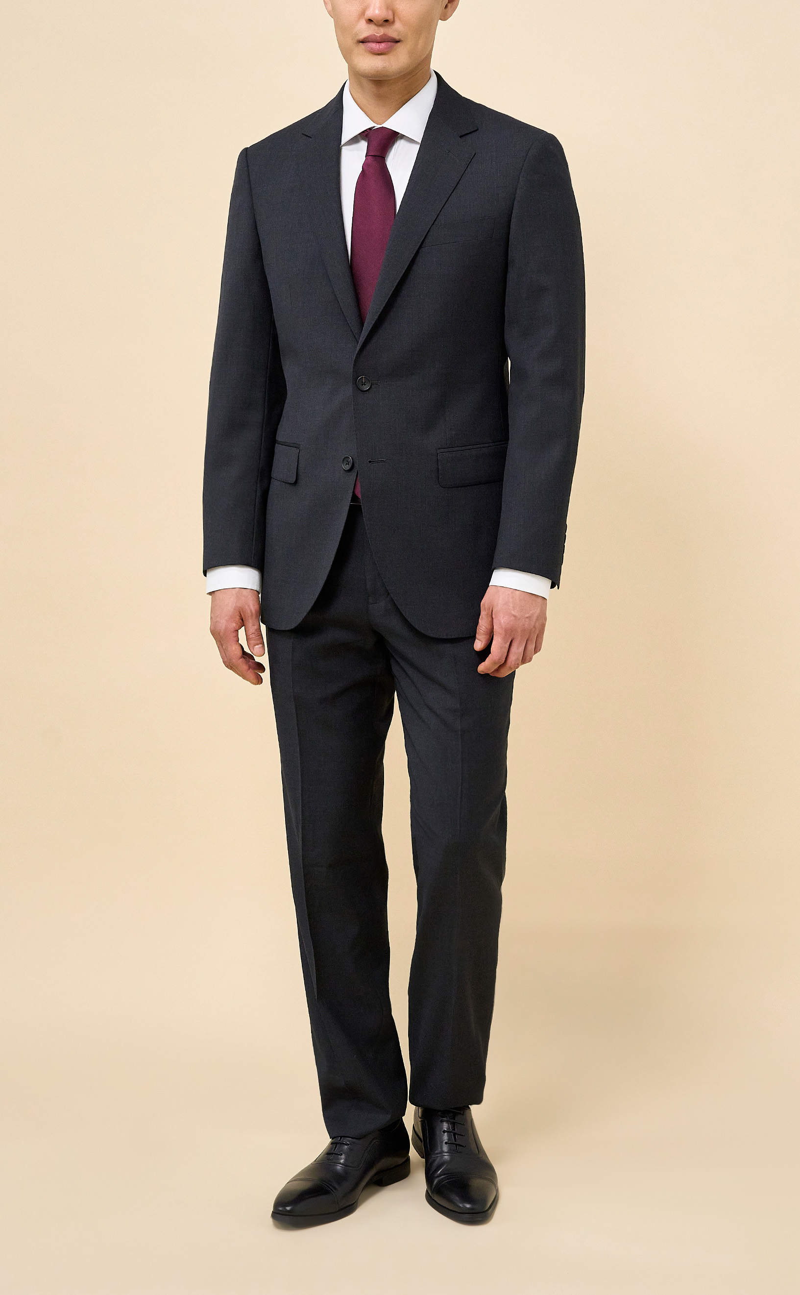 Crafted from 100% Merino wool in an all-season weight, this Charcoal suit delivers year-round comfort with refined structure and drape. The half-canvassed jacket features lightly padded shoulders, notch lapels, a two-button closure, and double vents. Flat-front trousers with slanted pockets, rear button-through pockets, and an unfinished inseam complete the look, ready for custom tailoring.