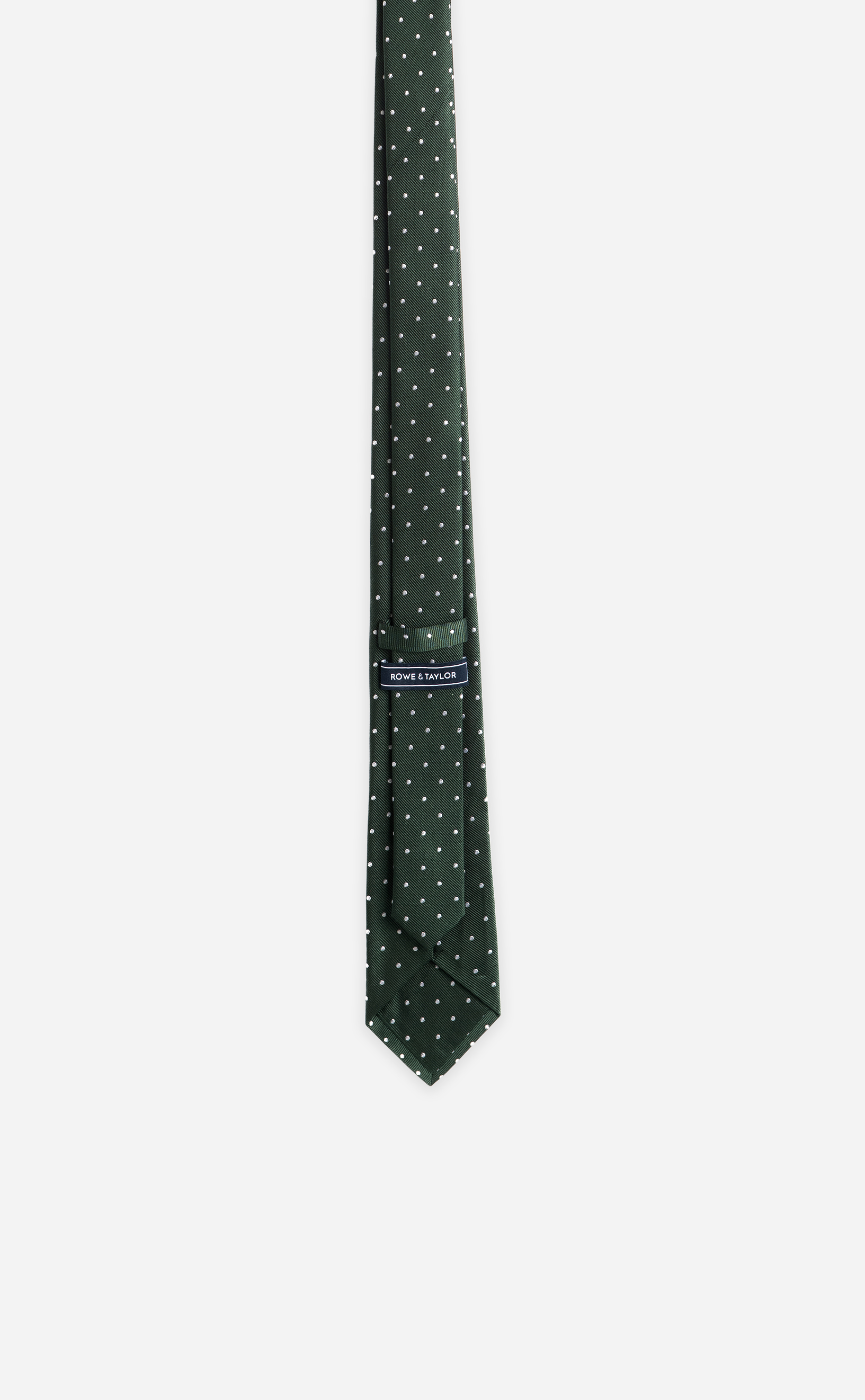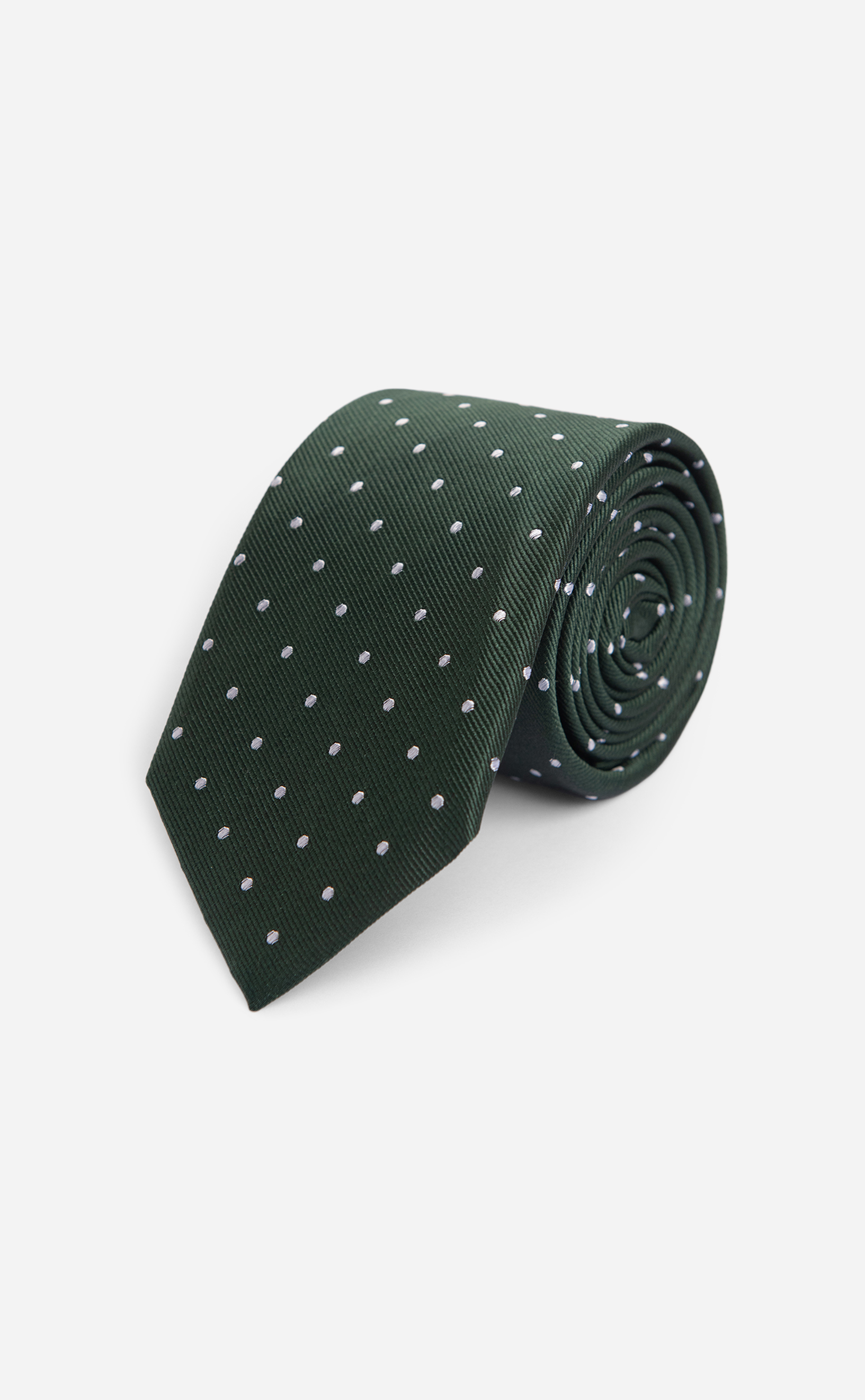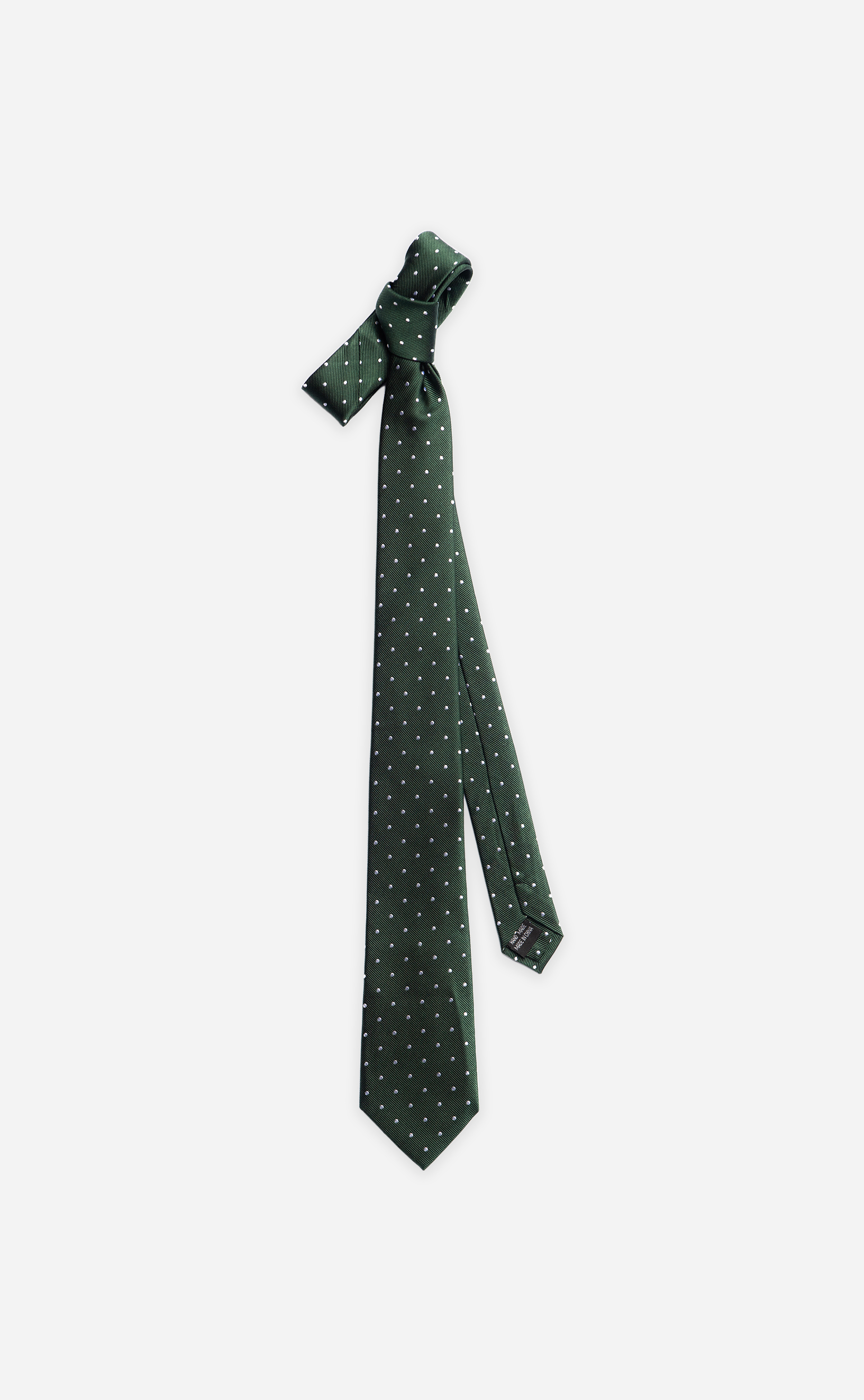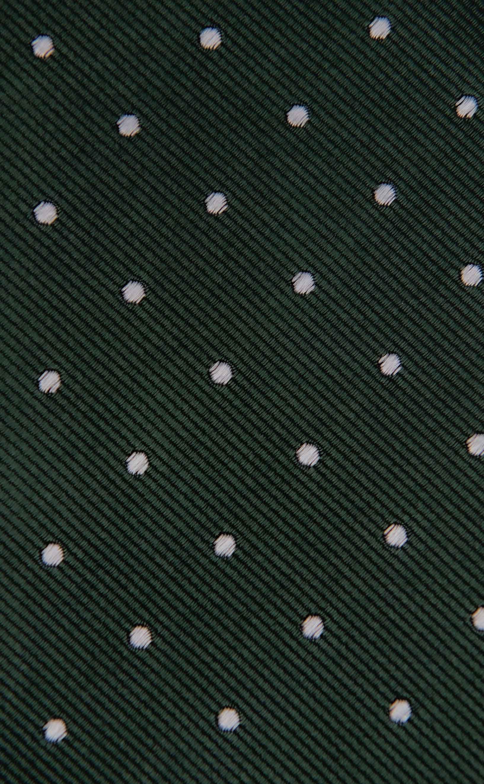 Made from 100% silk with a diagonal twill weave, this Dark Green twill polkadot 3.25-inch self‑tipped tie is refined, durable, and perfect for weddings or formal celebrations.
