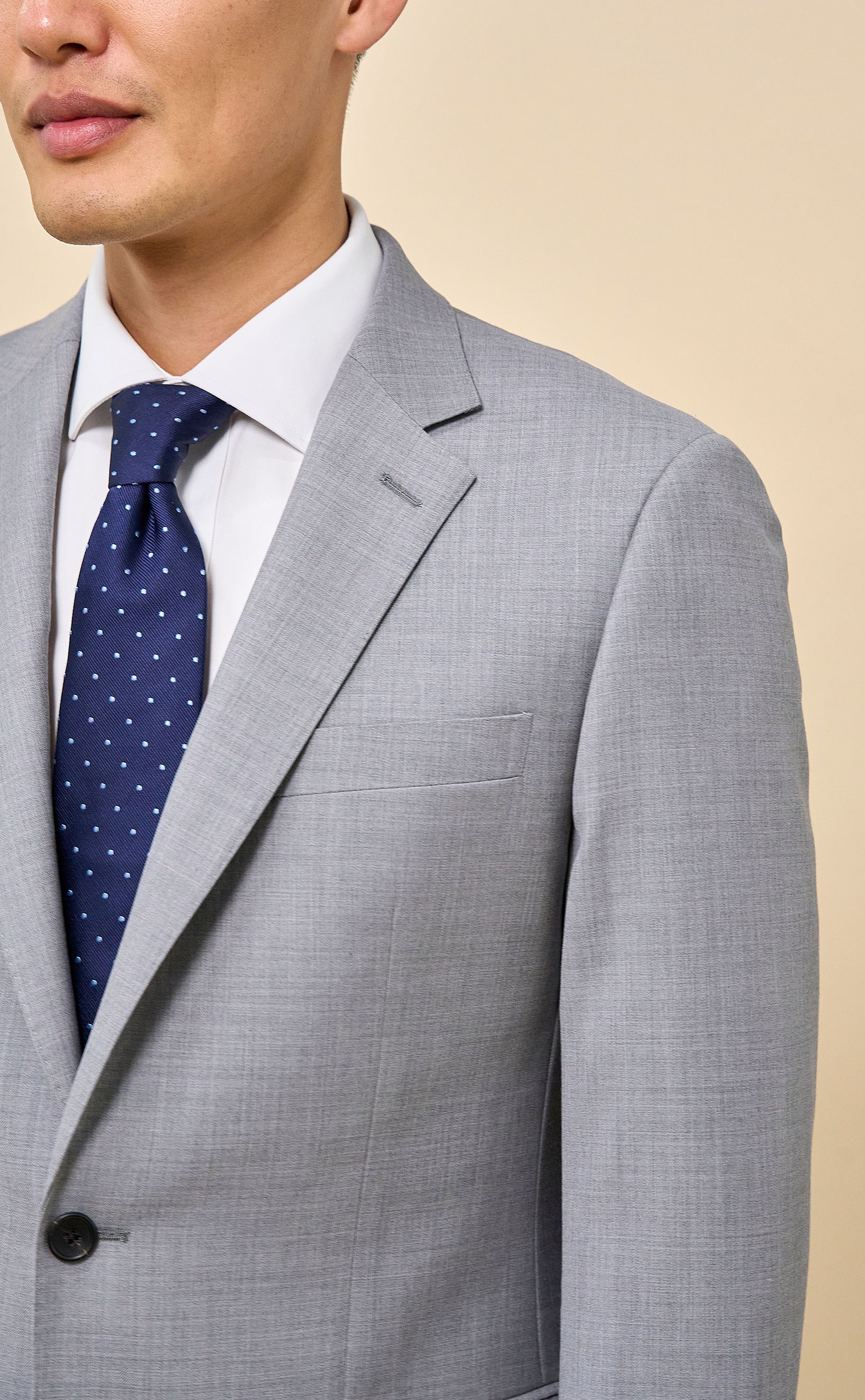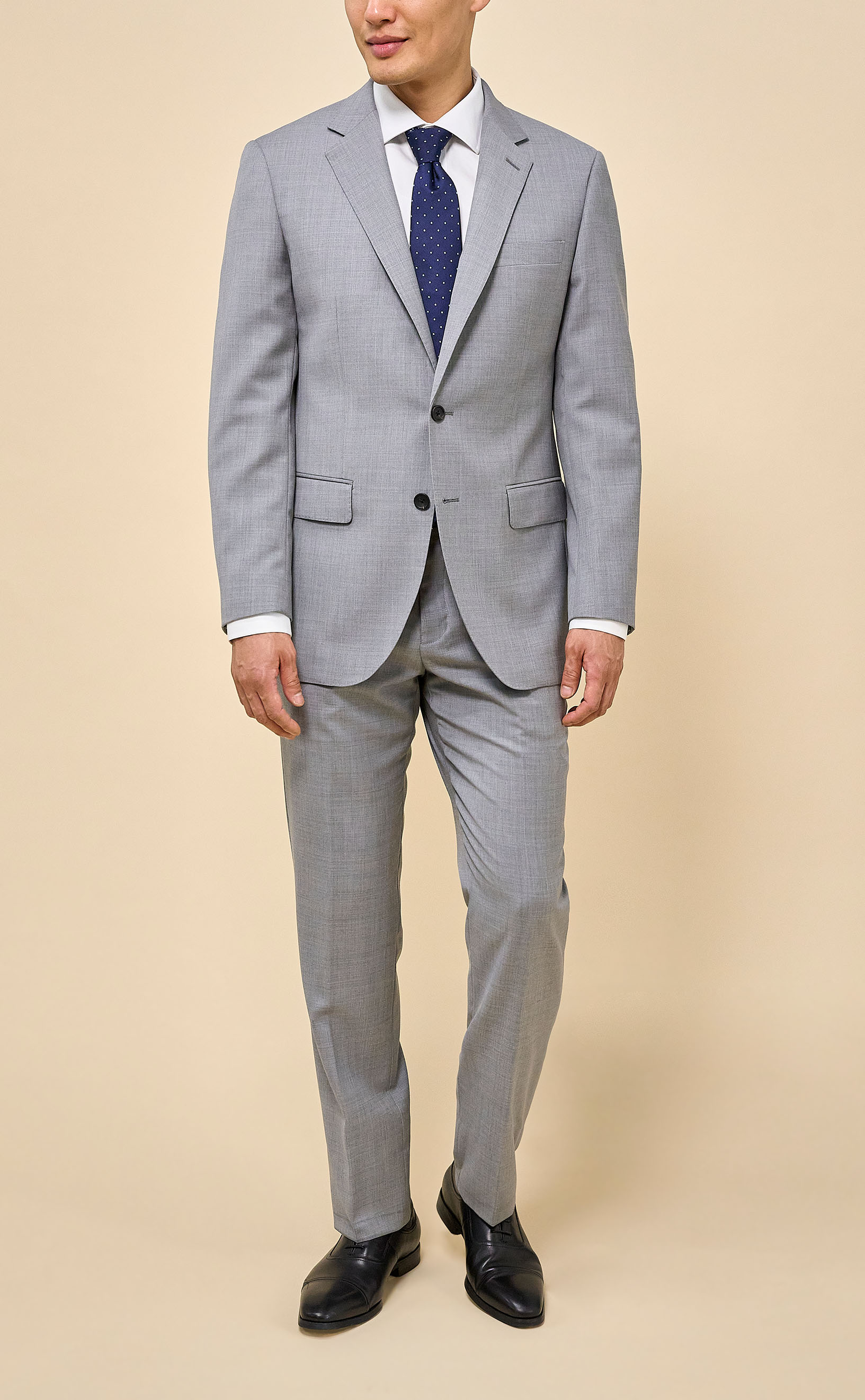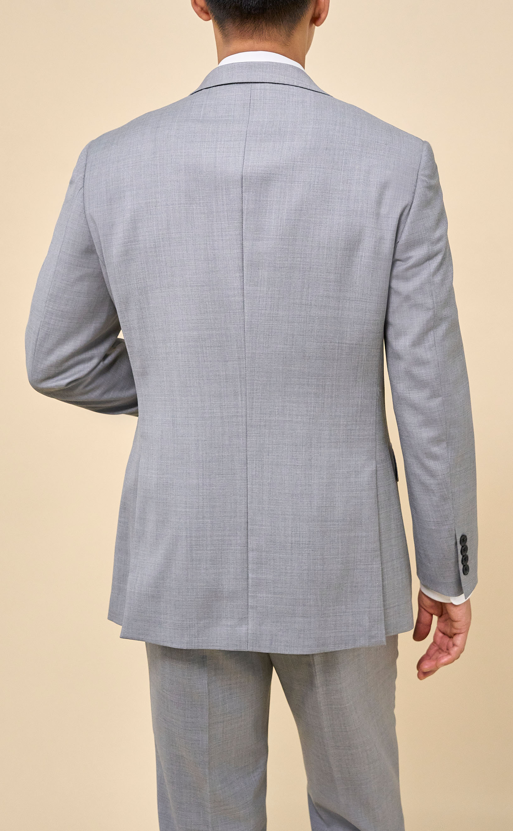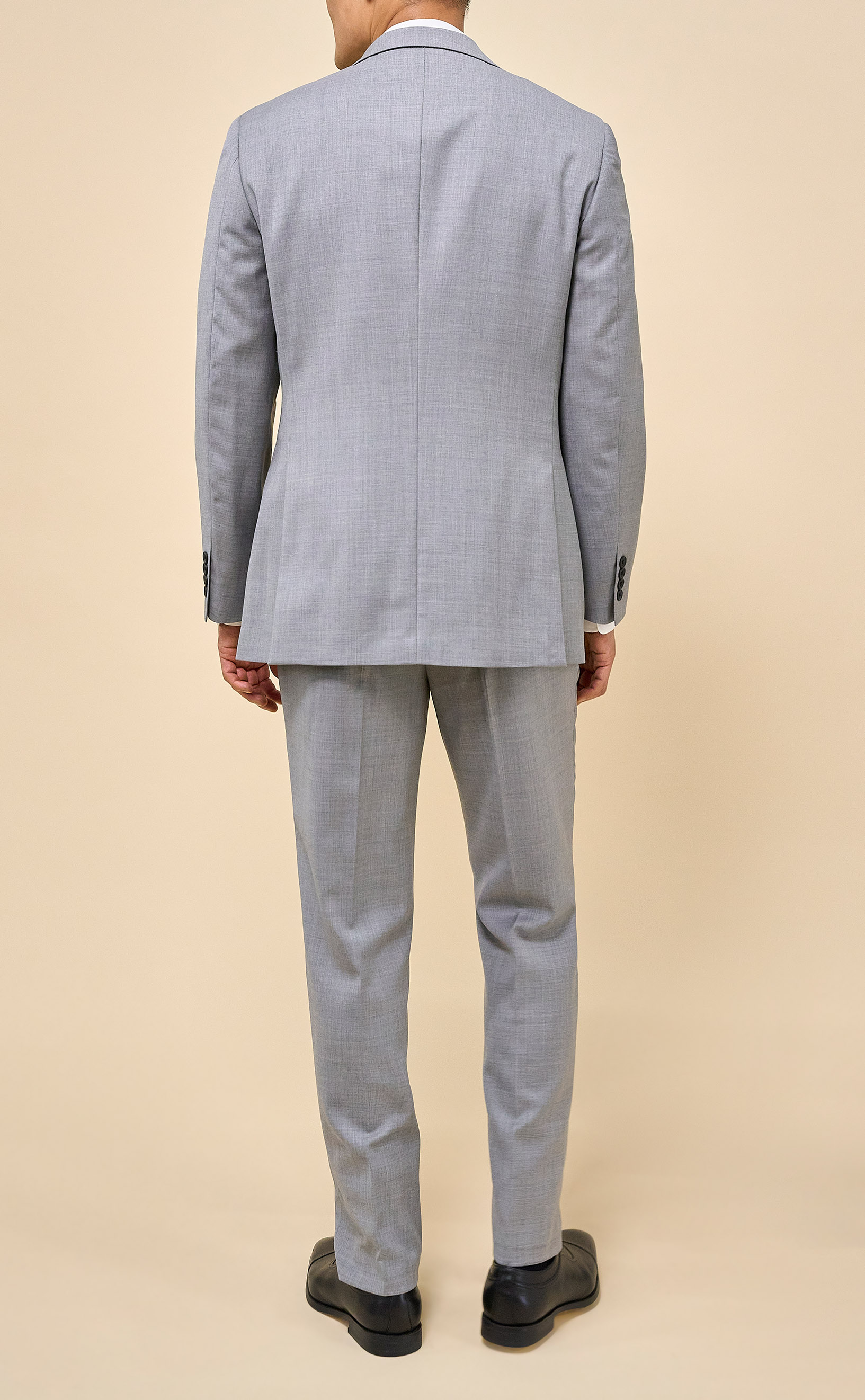 Crafted from 100% Merino wool in an all-season weight, this Light Gray suit delivers year-round comfort with refined structure and drape. The half-canvassed jacket features lightly padded shoulders, notch lapels, a two-button closure, and double vents. Flat-front trousers with slanted pockets, rear button-through pockets, and an unfinished inseam complete the look, ready for custom tailoring.