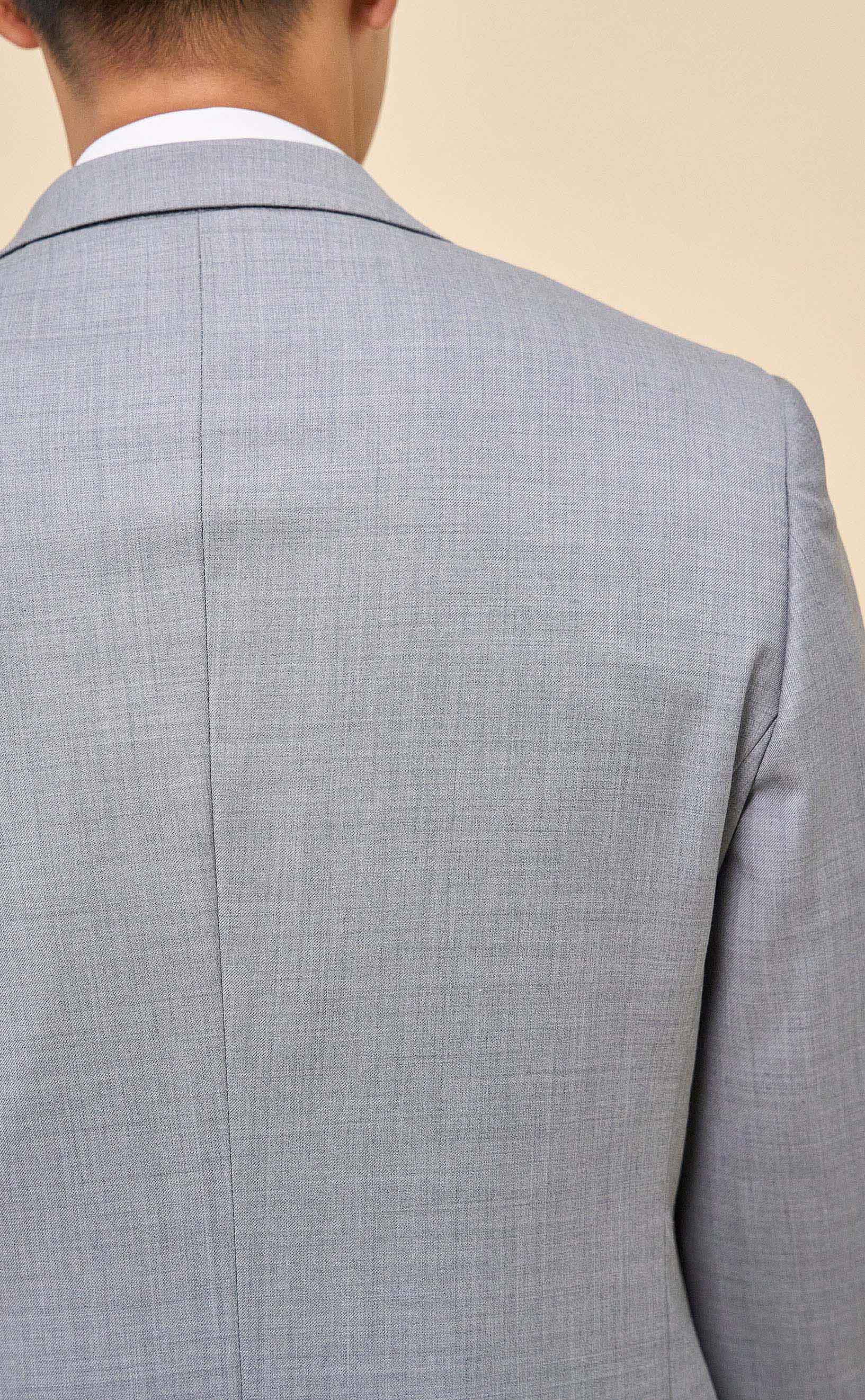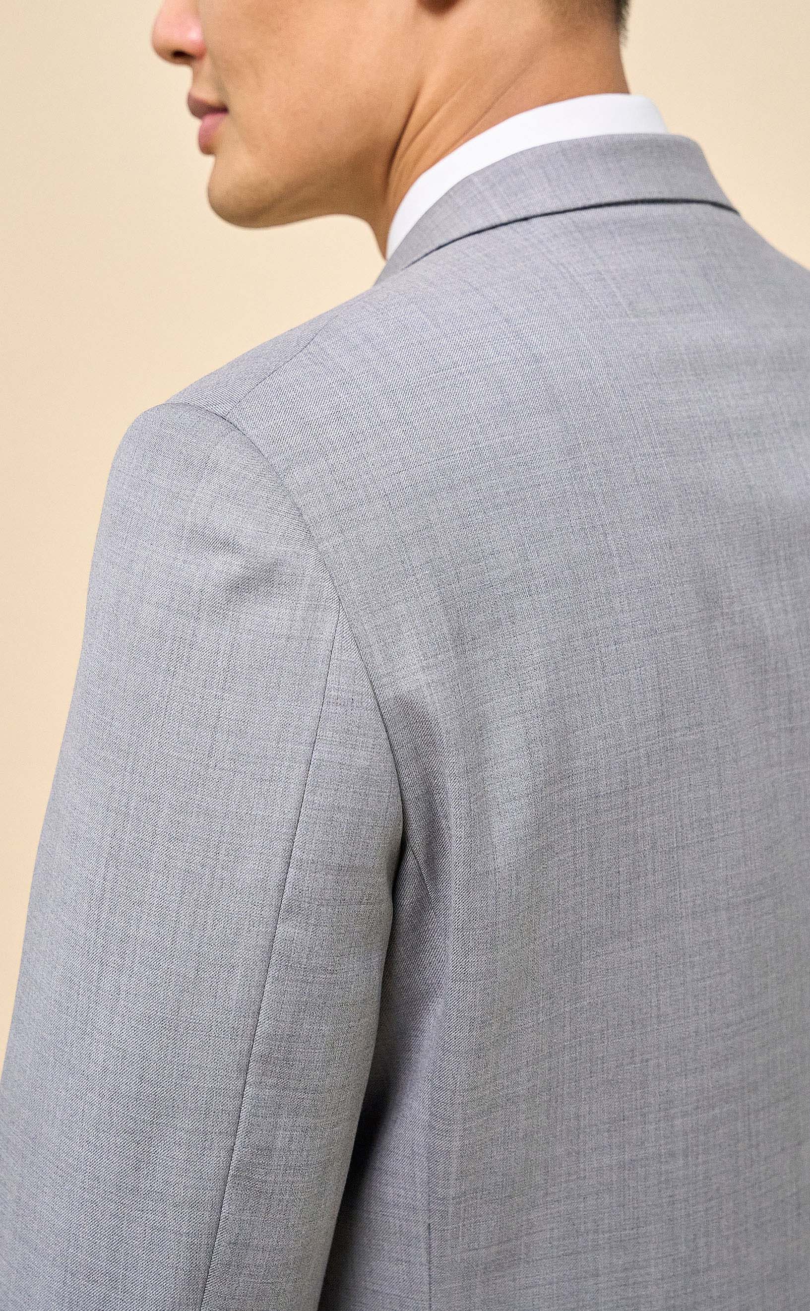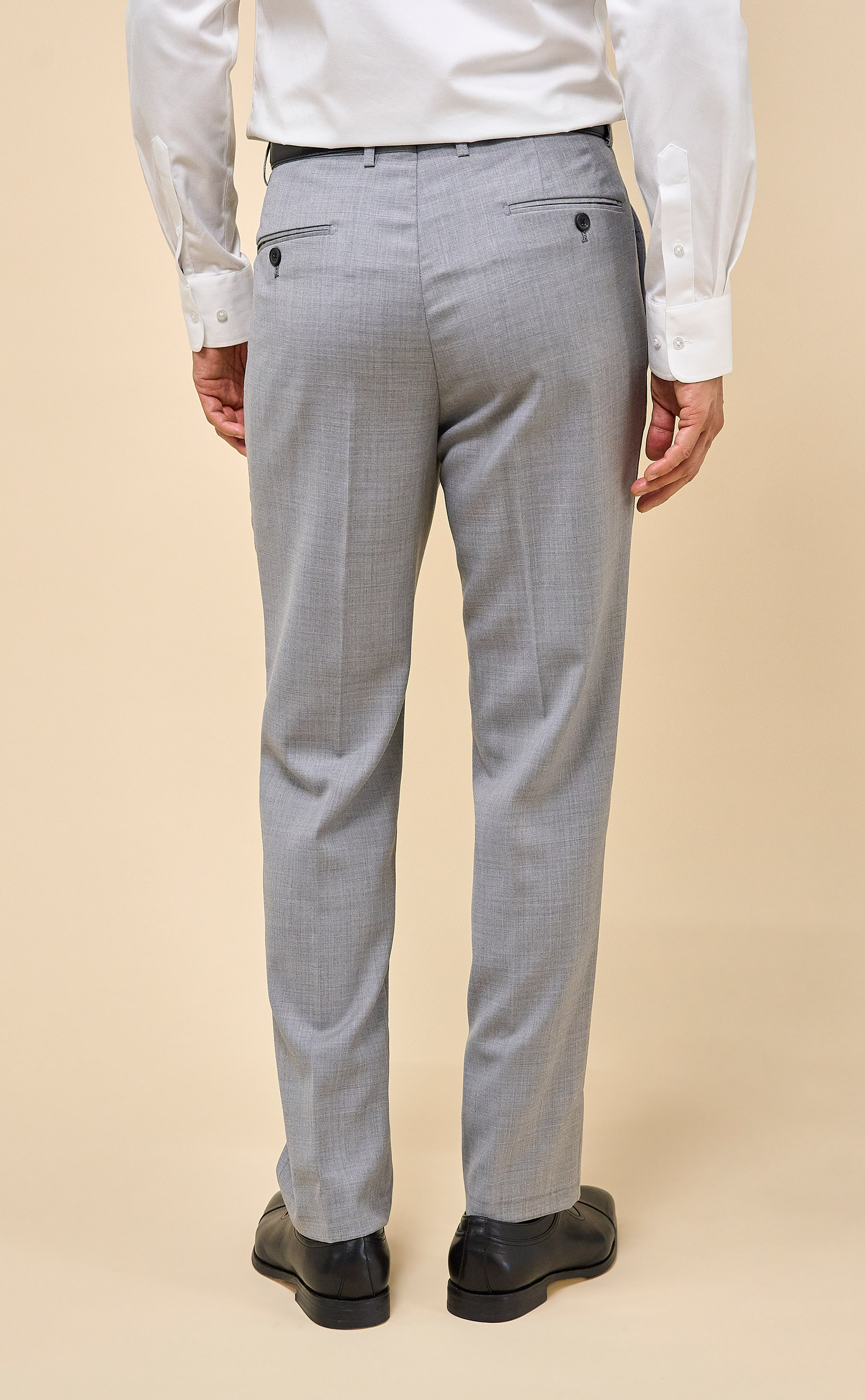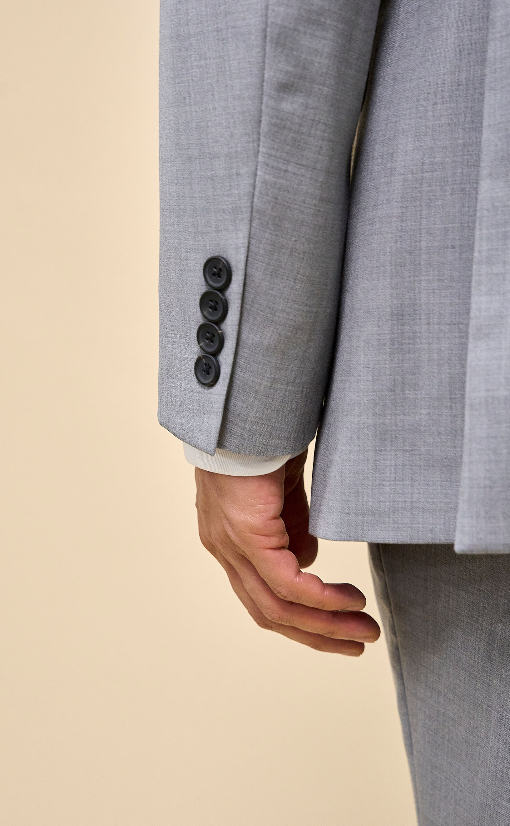 Crafted from 100% Merino wool in an all-season weight, this Light Gray suit delivers year-round comfort with refined structure and drape. The half-canvassed jacket features lightly padded shoulders, notch lapels, a two-button closure, and double vents. Flat-front trousers with slanted pockets, rear button-through pockets, and an unfinished inseam complete the look, ready for custom tailoring.