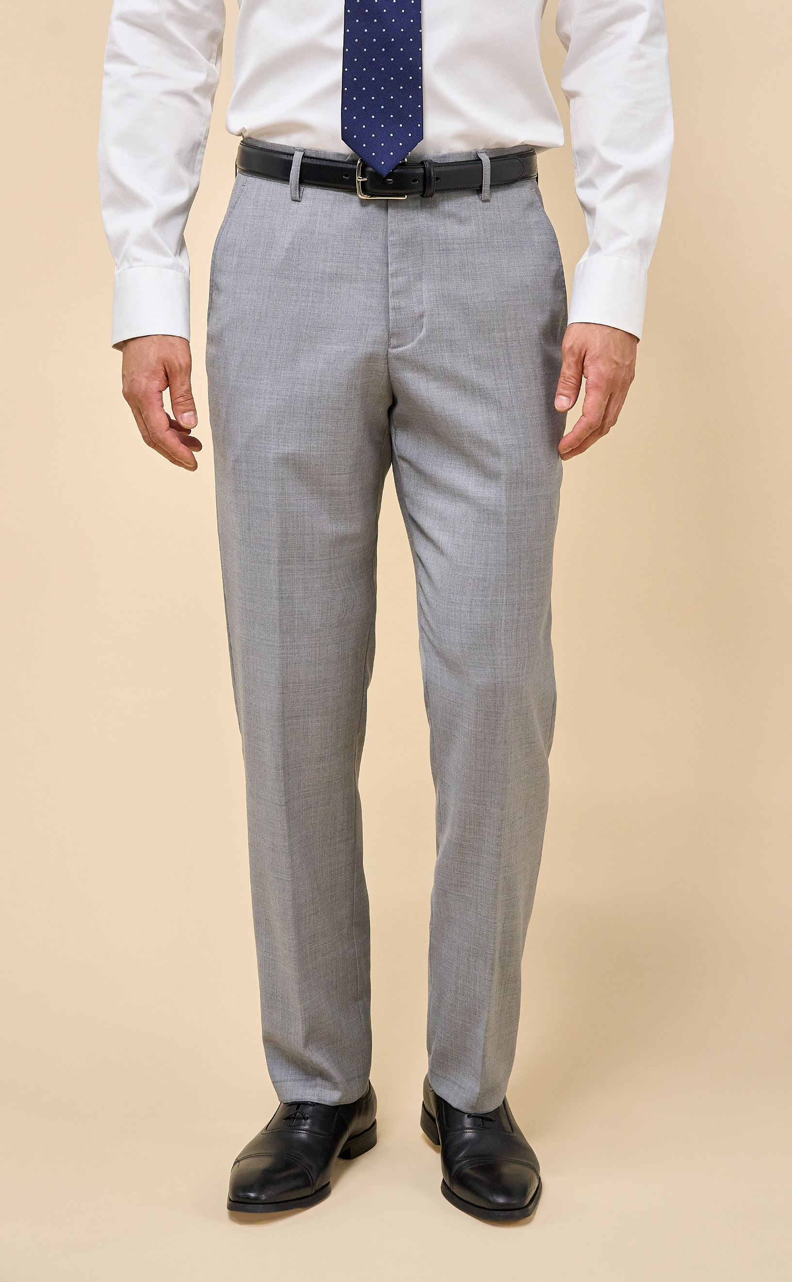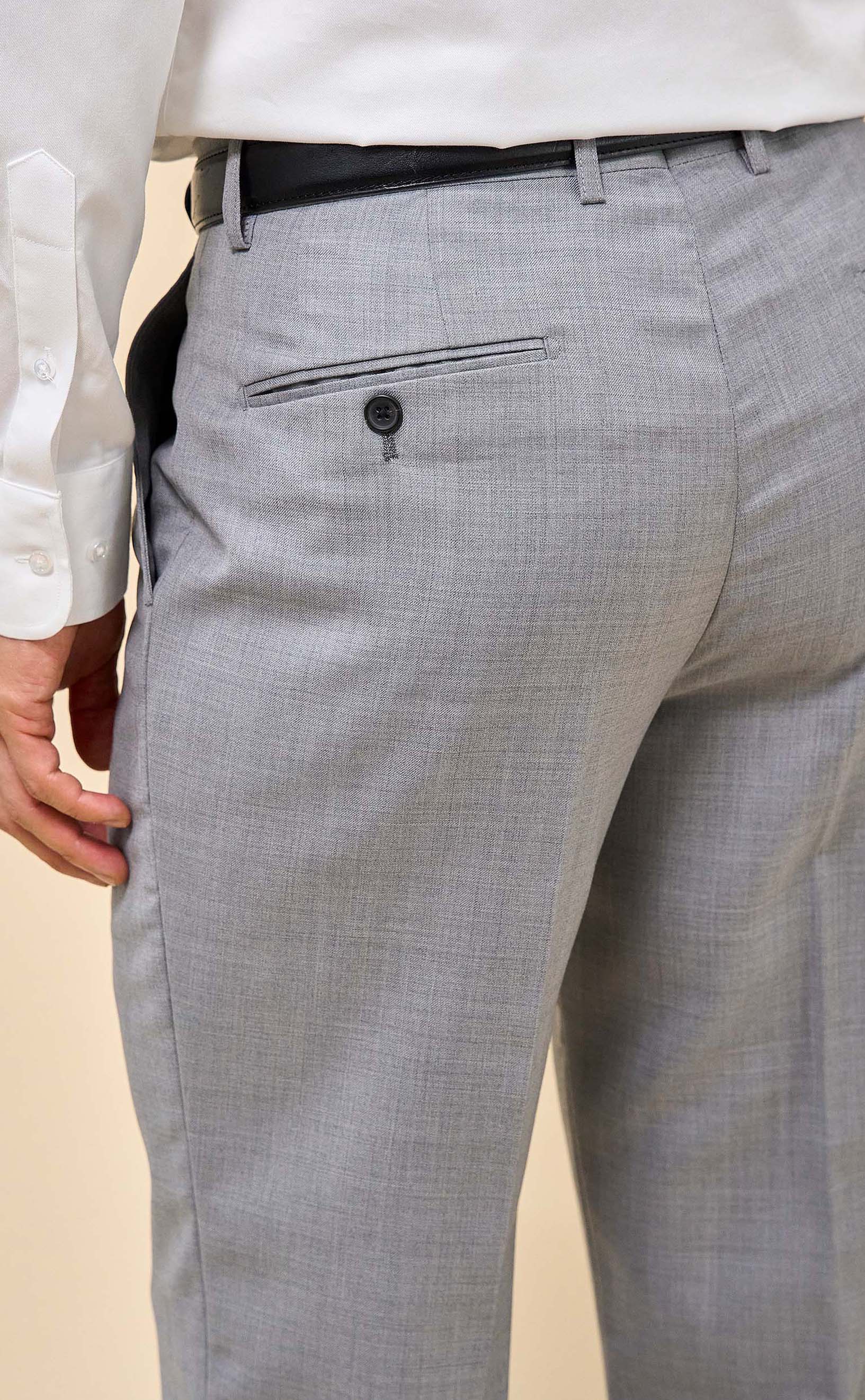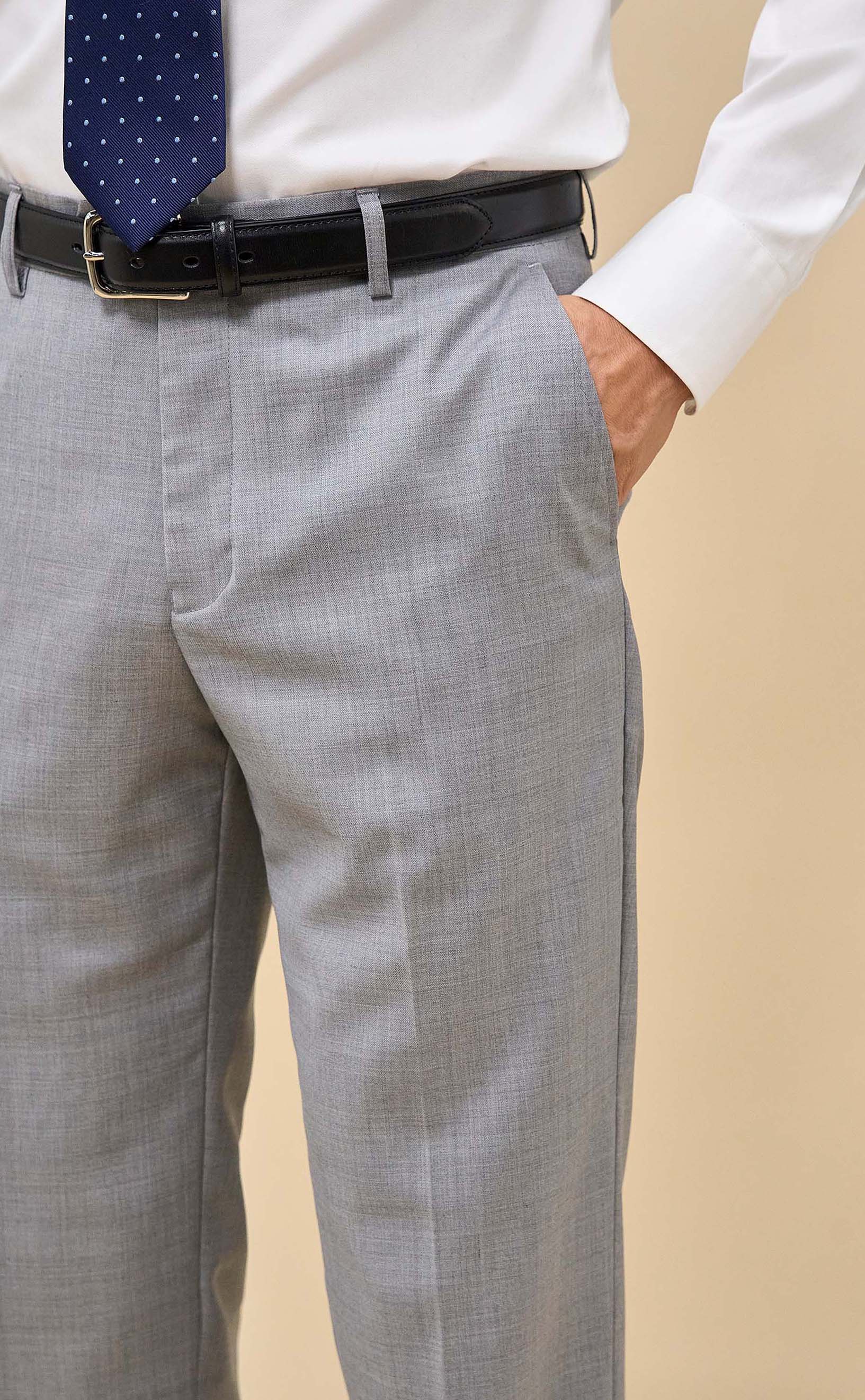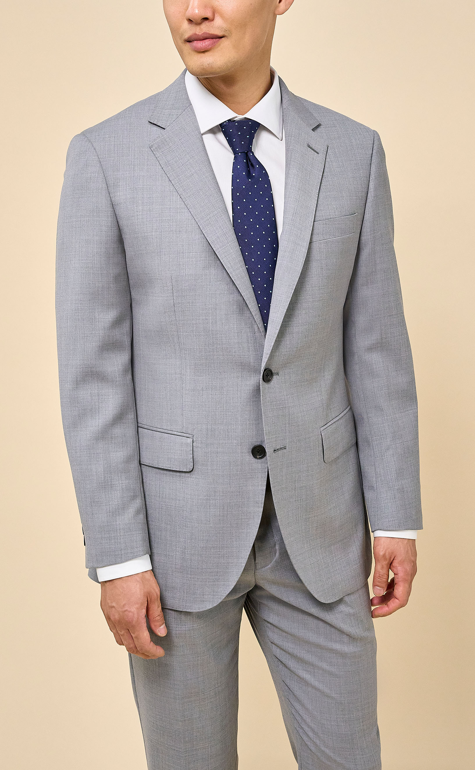 Crafted from 100% Merino wool in an all-season weight, this Light Gray suit delivers year-round comfort with refined structure and drape. The half-canvassed jacket features lightly padded shoulders, notch lapels, a two-button closure, and double vents. Flat-front trousers with slanted pockets, rear button-through pockets, and an unfinished inseam complete the look, ready for custom tailoring.