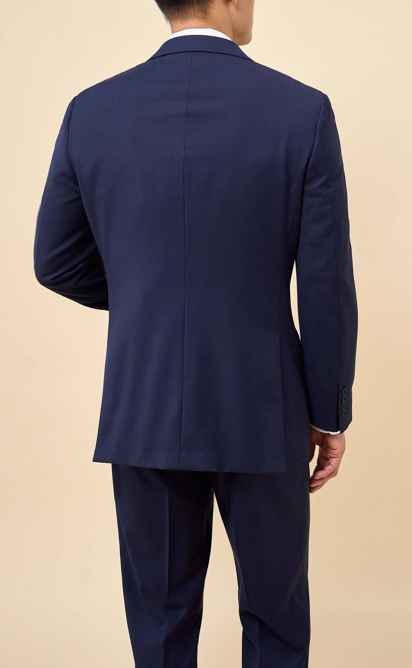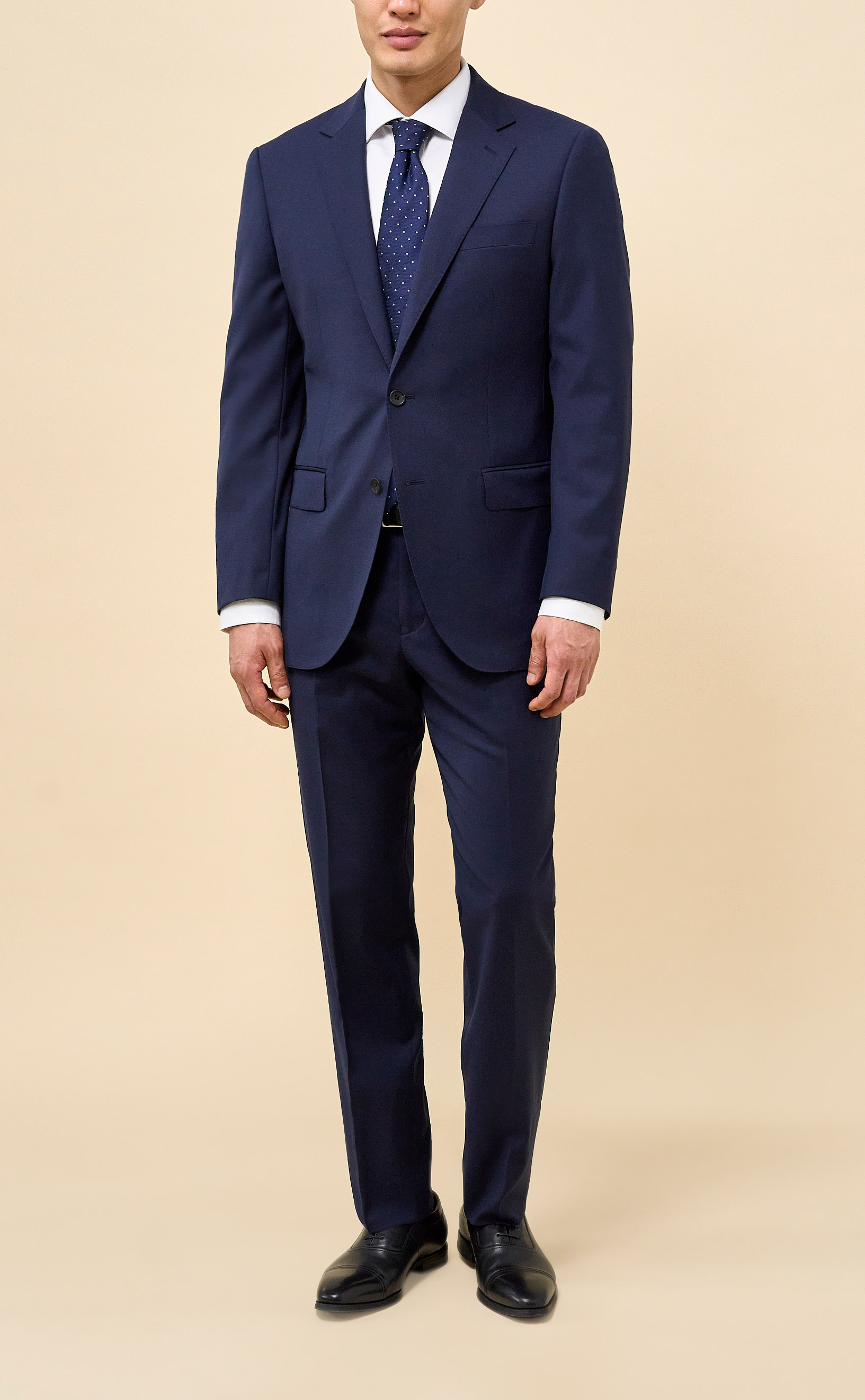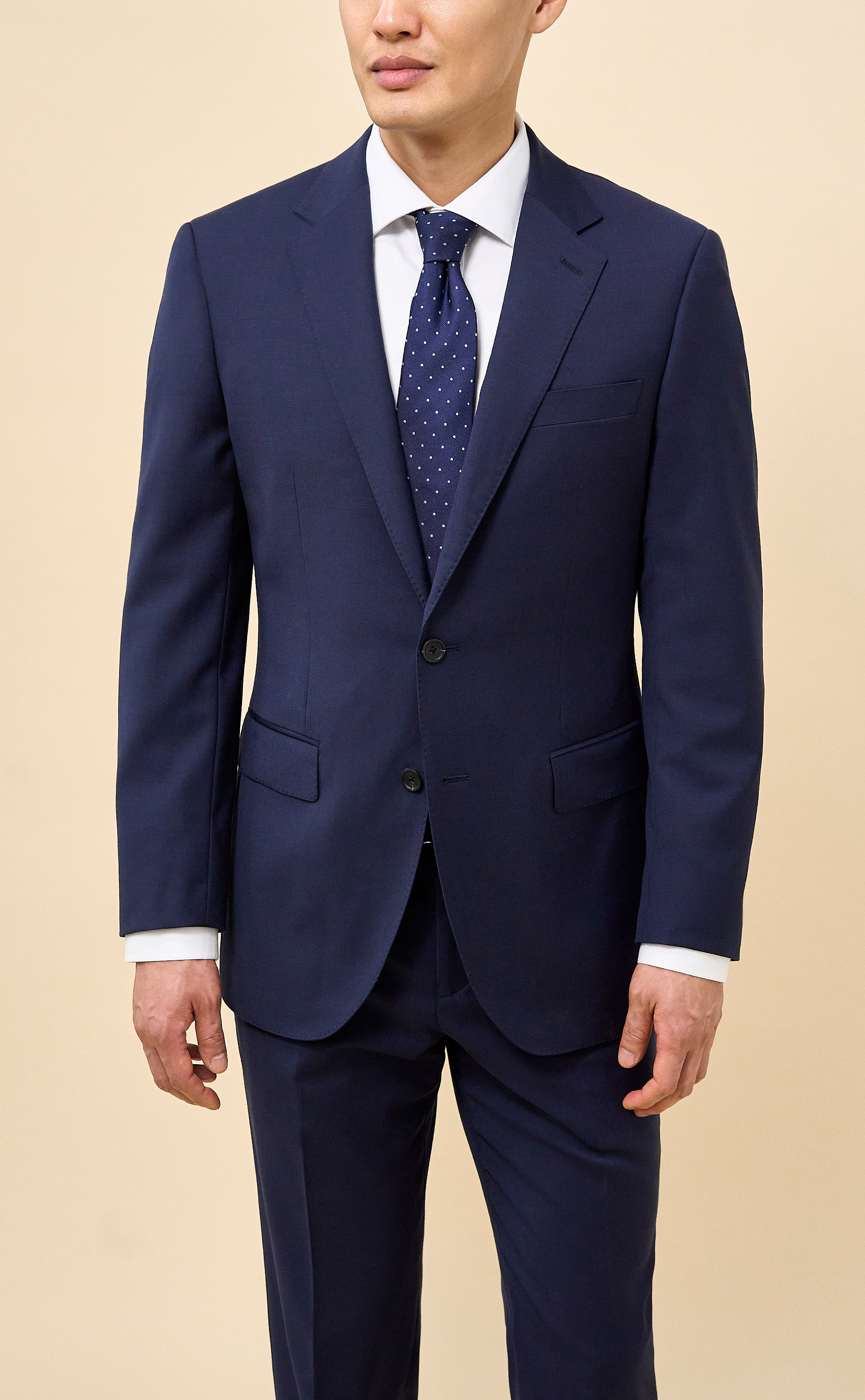 This Navy suit is tailored from an all-season performance stretch wool blend that offers durability, wrinkle resistance, and lasting comfort. The half-canvassed jacket is finished with lightly padded shoulders, notch lapels, and double vents, while the trousers feature a regular rise, flat front, belt loops, slanted side pockets, and two rear button-through jetted pockets.
