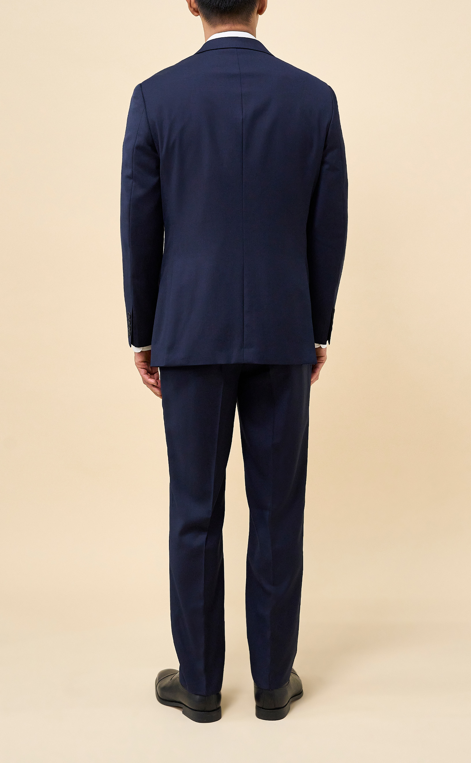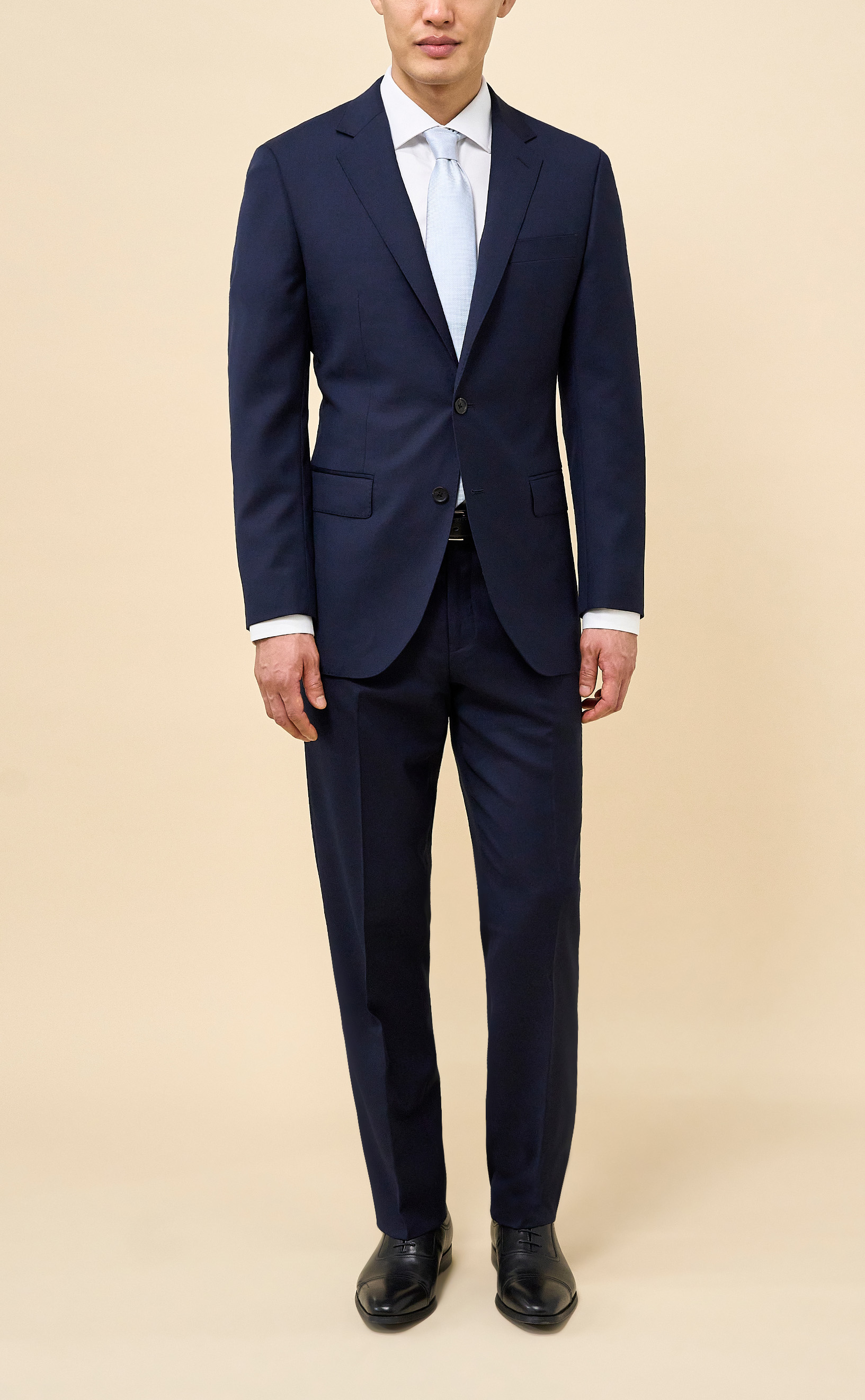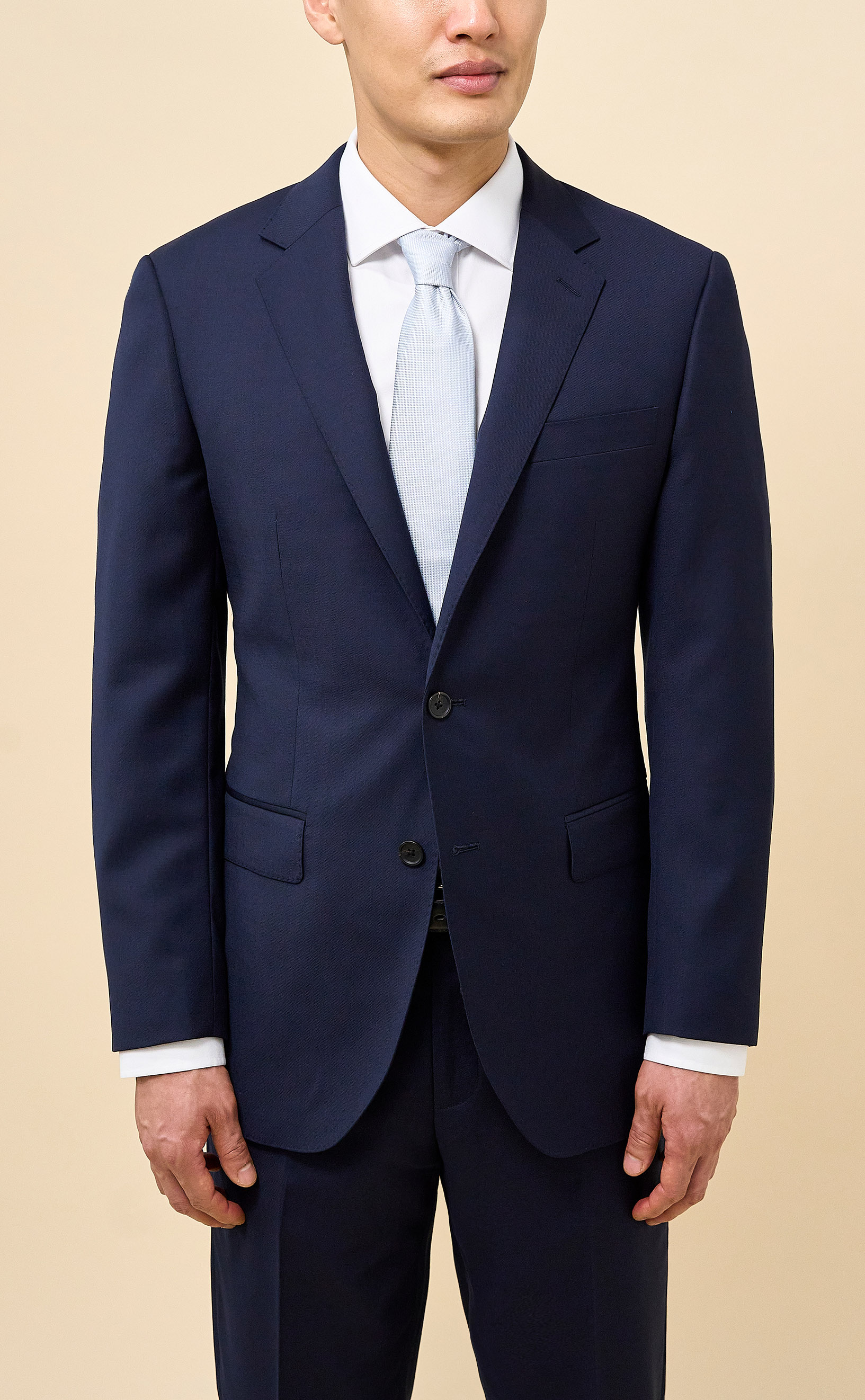 Crafted from 100% Merino wool in an all-season weight, this Navy suit delivers year-round comfort with refined structure and drape. The half-canvassed jacket features lightly padded shoulders, notch lapels, a two-button closure, and double vents. Flat-front trousers with slanted pockets, rear button-through pockets, and an unfinished inseam complete the look, ready for custom tailoring.