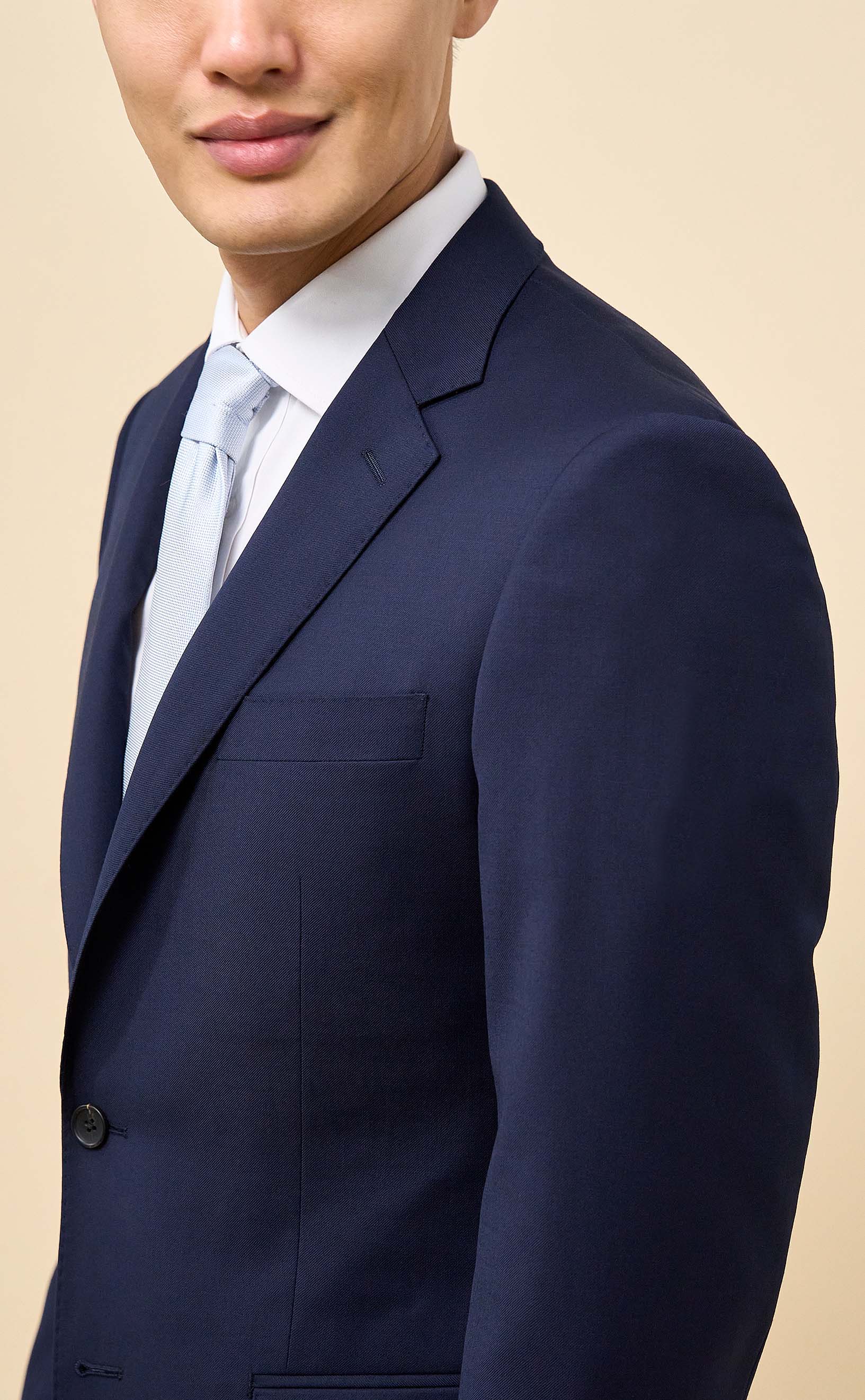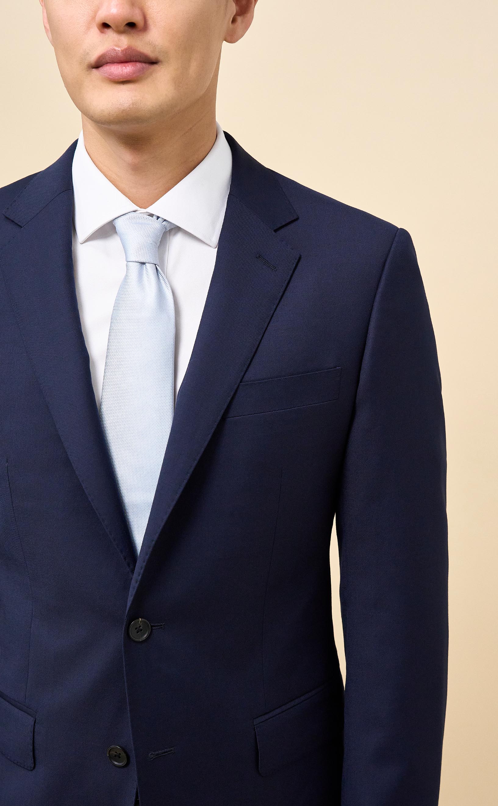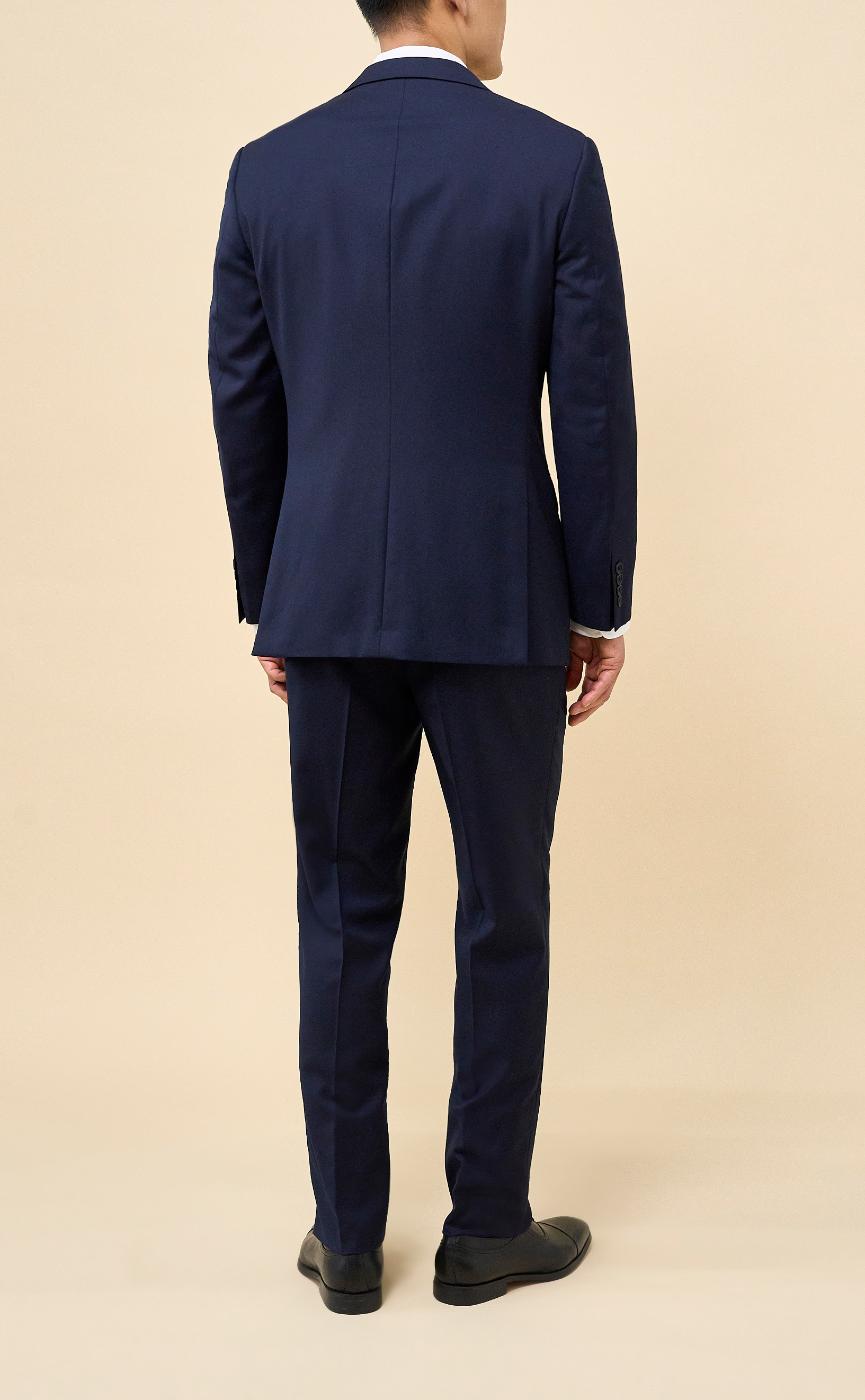 Crafted from 100% Merino wool in an all-season weight, this Navy suit delivers year-round comfort with refined structure and drape. The half-canvassed jacket features lightly padded shoulders, notch lapels, a two-button closure, and double vents. Flat-front trousers with slanted pockets, rear button-through pockets, and an unfinished inseam complete the look, ready for custom tailoring.